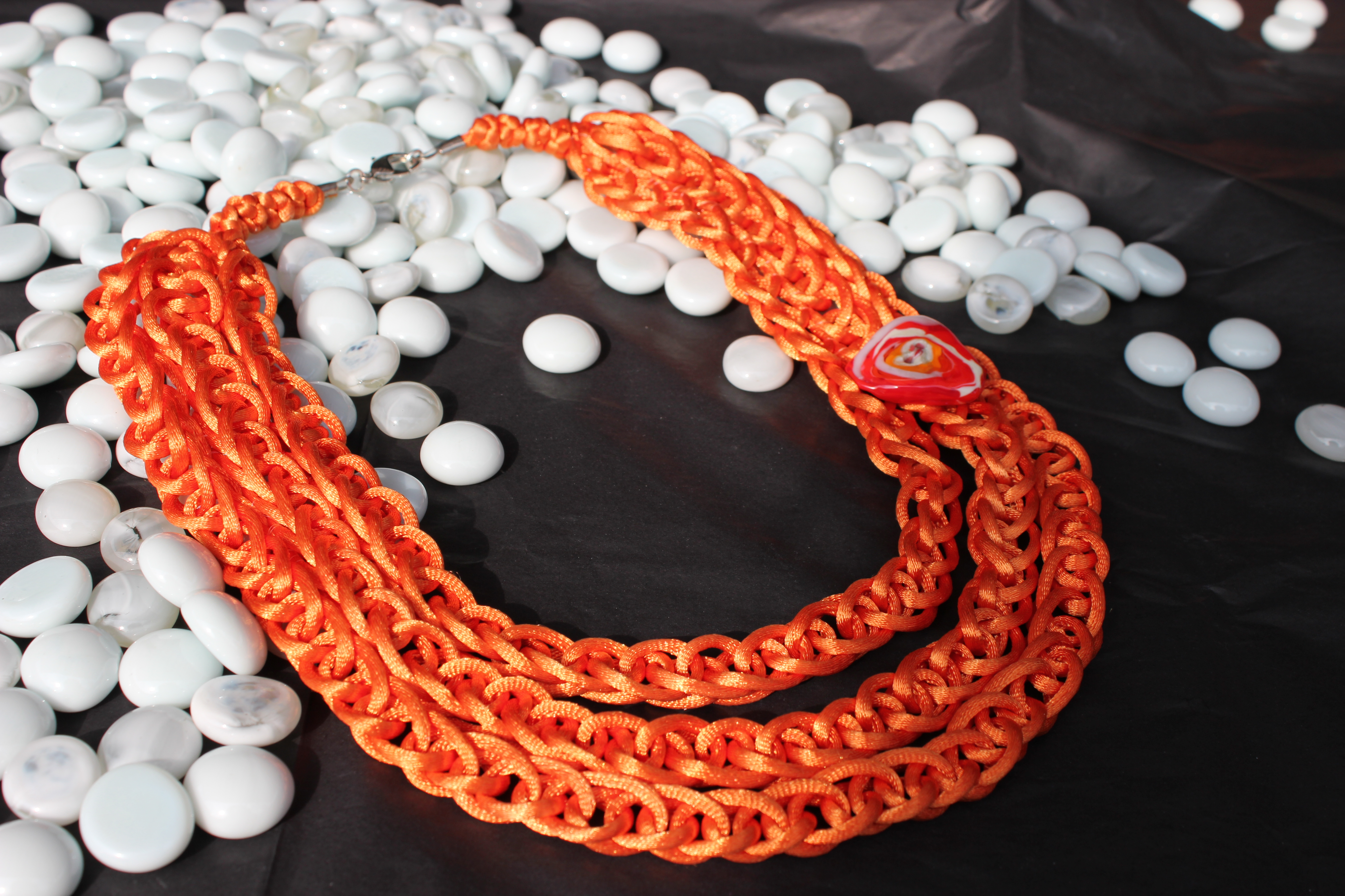 Een zeer licht sieraad van satijnkoord met een handgemaakte knoop van glas.