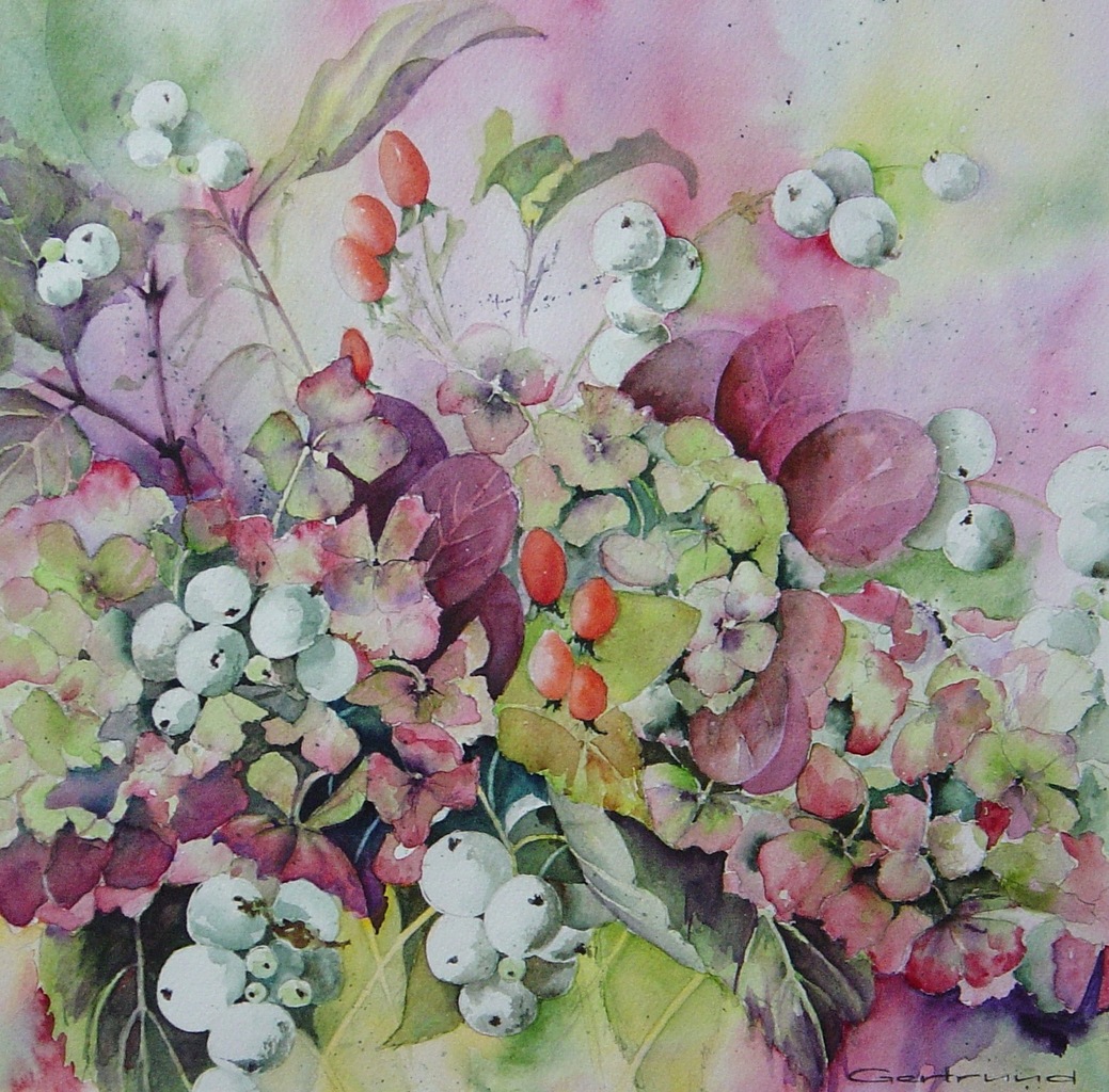 Hortensia met witte besjes en rozenbottel