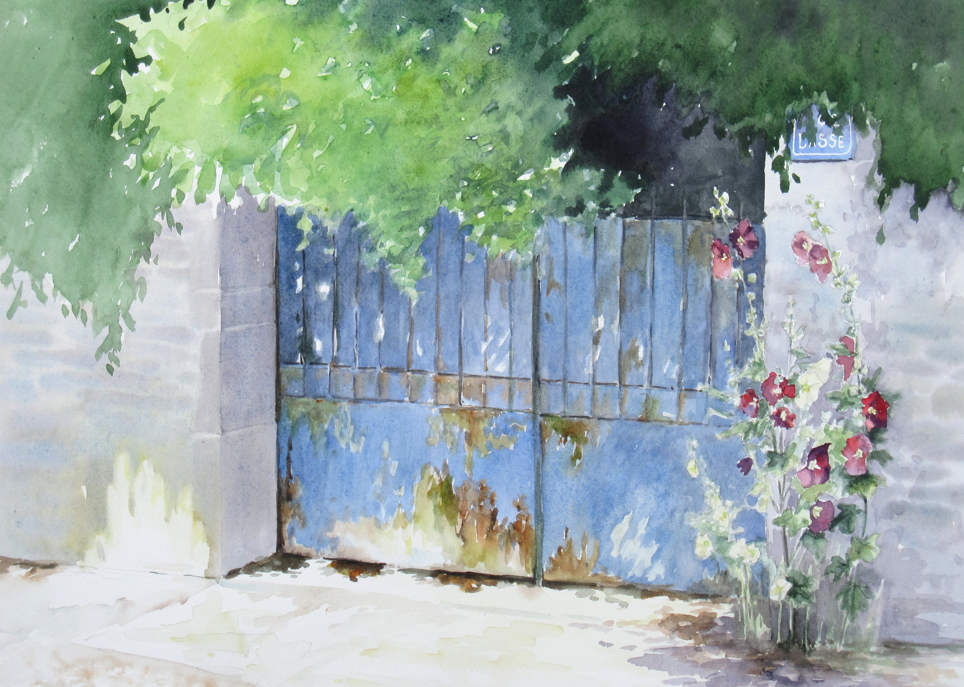stokrozen bij verroest hek in zonnig Frans dorpje