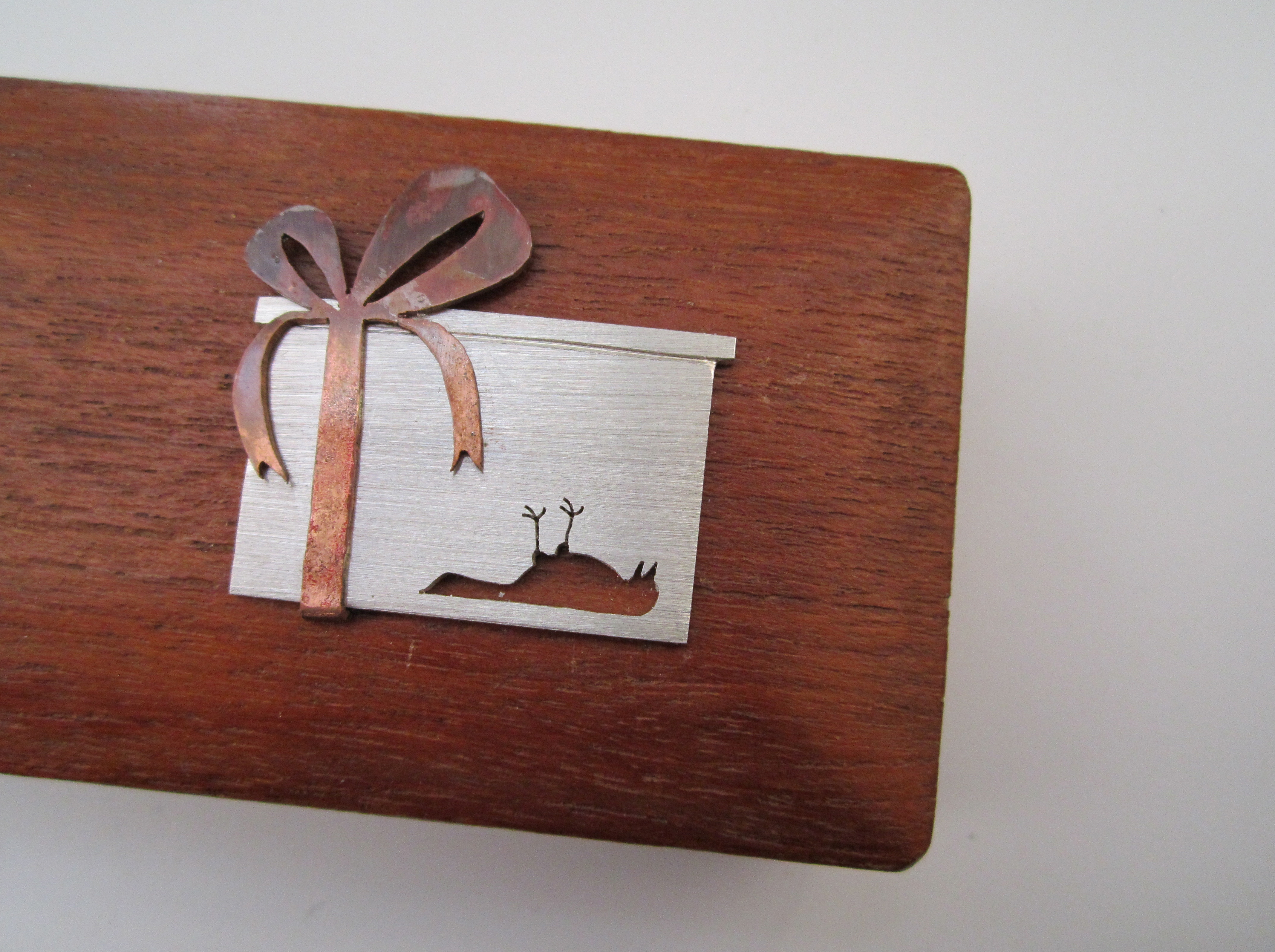 Doosje uit een serie spreekwoordsieraden: 'Iemand blij maken met een dode mus' Materiaal: Hout, zilver, koper. Bijdrage verpakkings- en verzendkosten: €5,- Wordt vanweg de waarde aangetekend verstuurd.