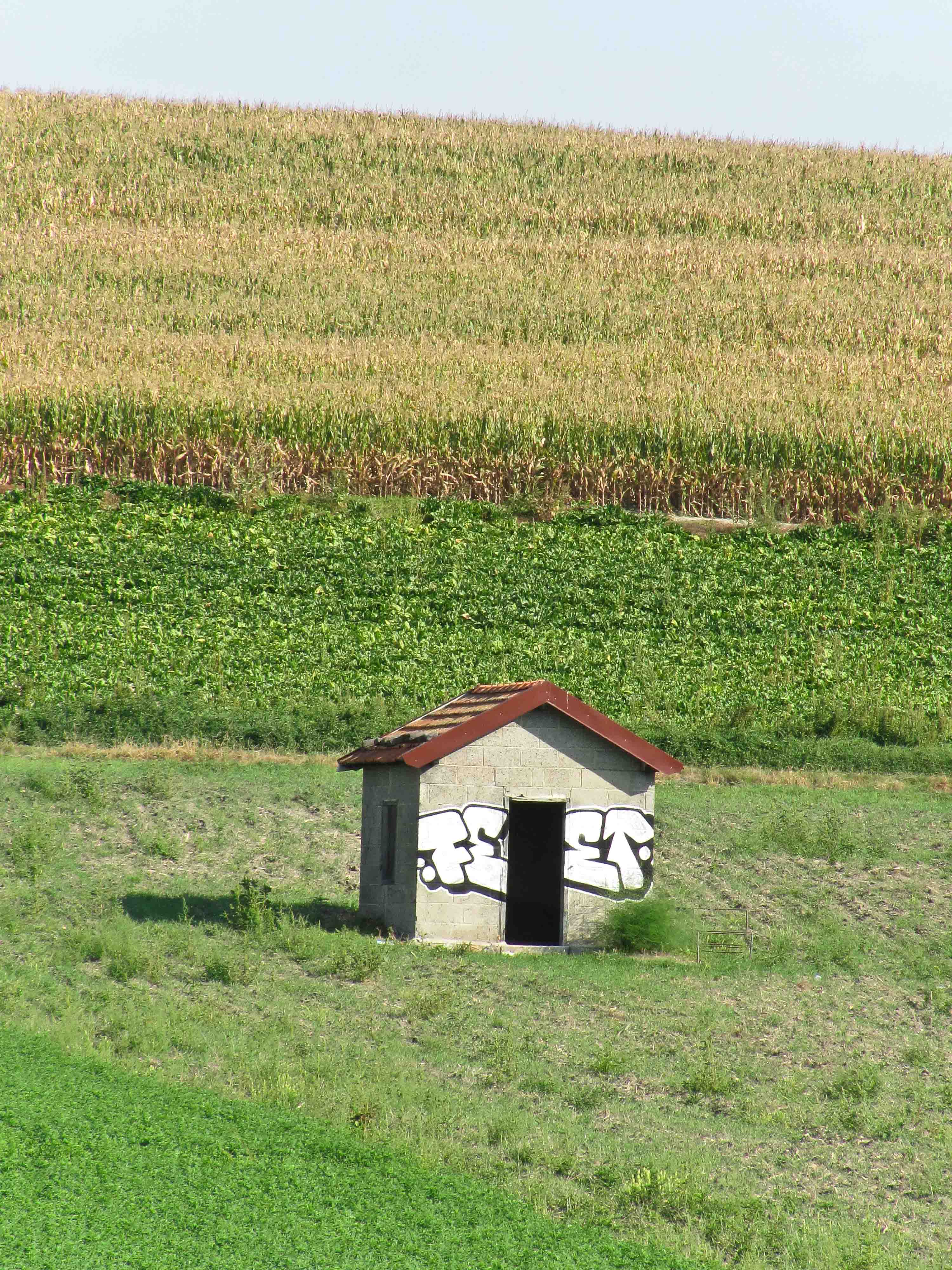 Het ziet eruit alsof een poppenmoeder haar poppenhuisjes hier en daar in het weiland heeft gezet. Lief en onschuldig. Kijk je een tweede keer dan is die argeloosheid meteen verdwenen. Ook op het boerenland in het midden van Frankrijk ontkomen kleine bergbouwsels niet aan contemporaine beschildering.