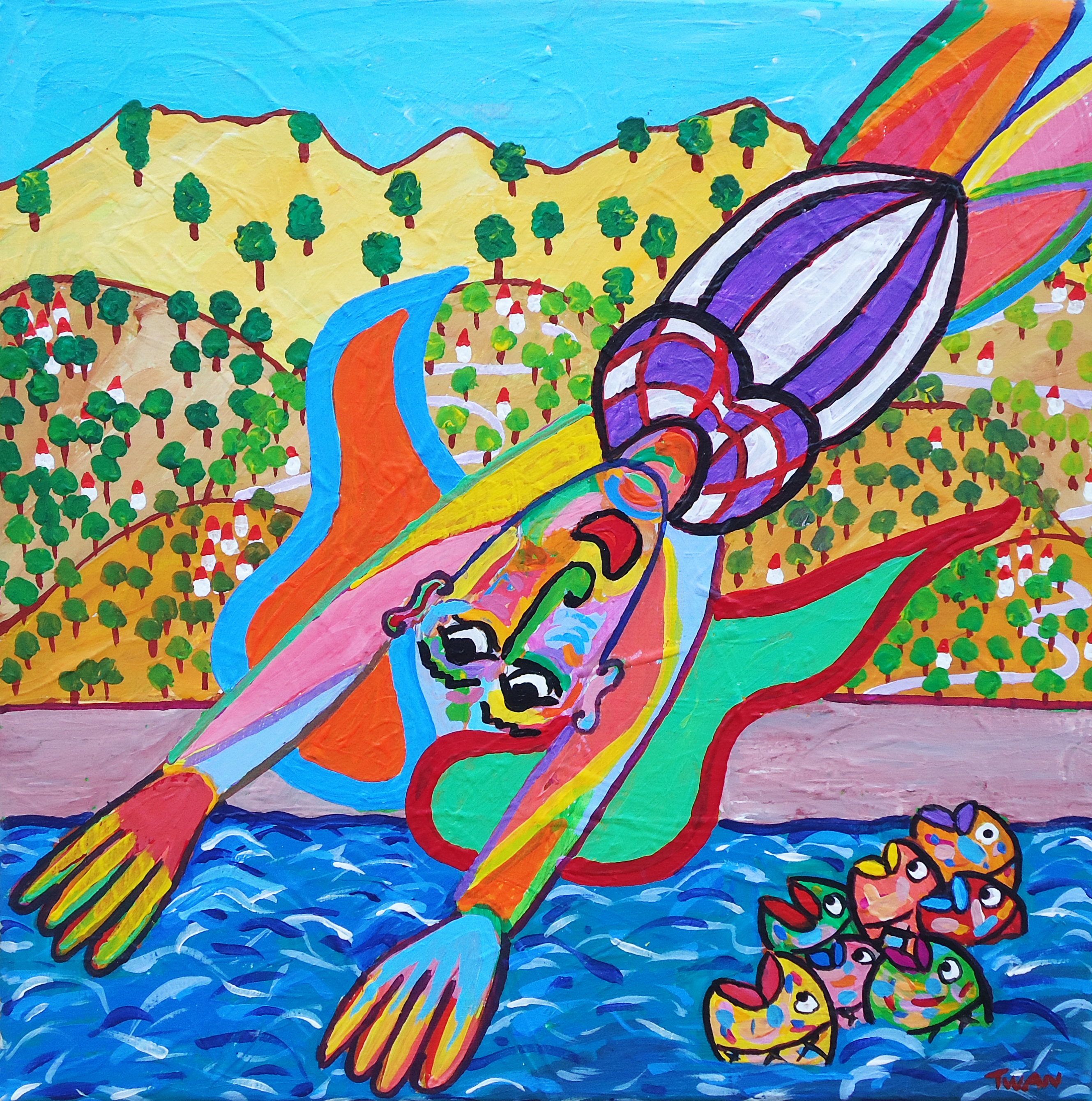 Schilderij Zee Vrouw Woman Painting Vakantie Vissen Zwemmen Sea Fish Diving Holiday Duiken Swimming