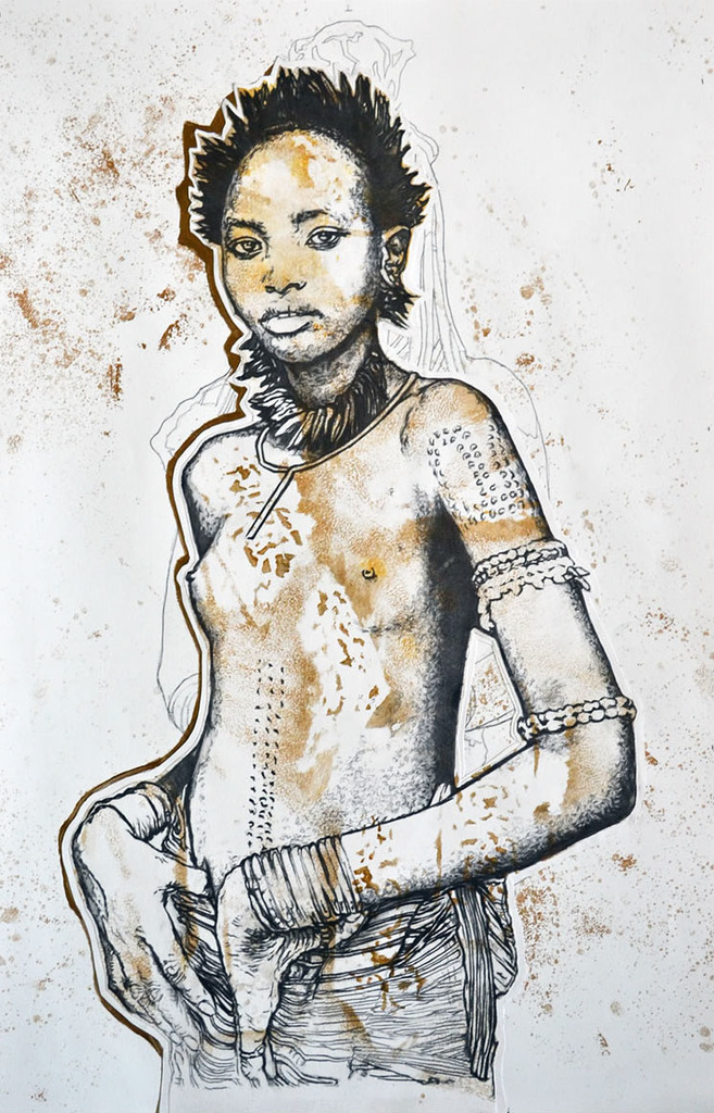 Mursivrouw getekend op bewerkt papier en bevestigd op monotype achtergrond.