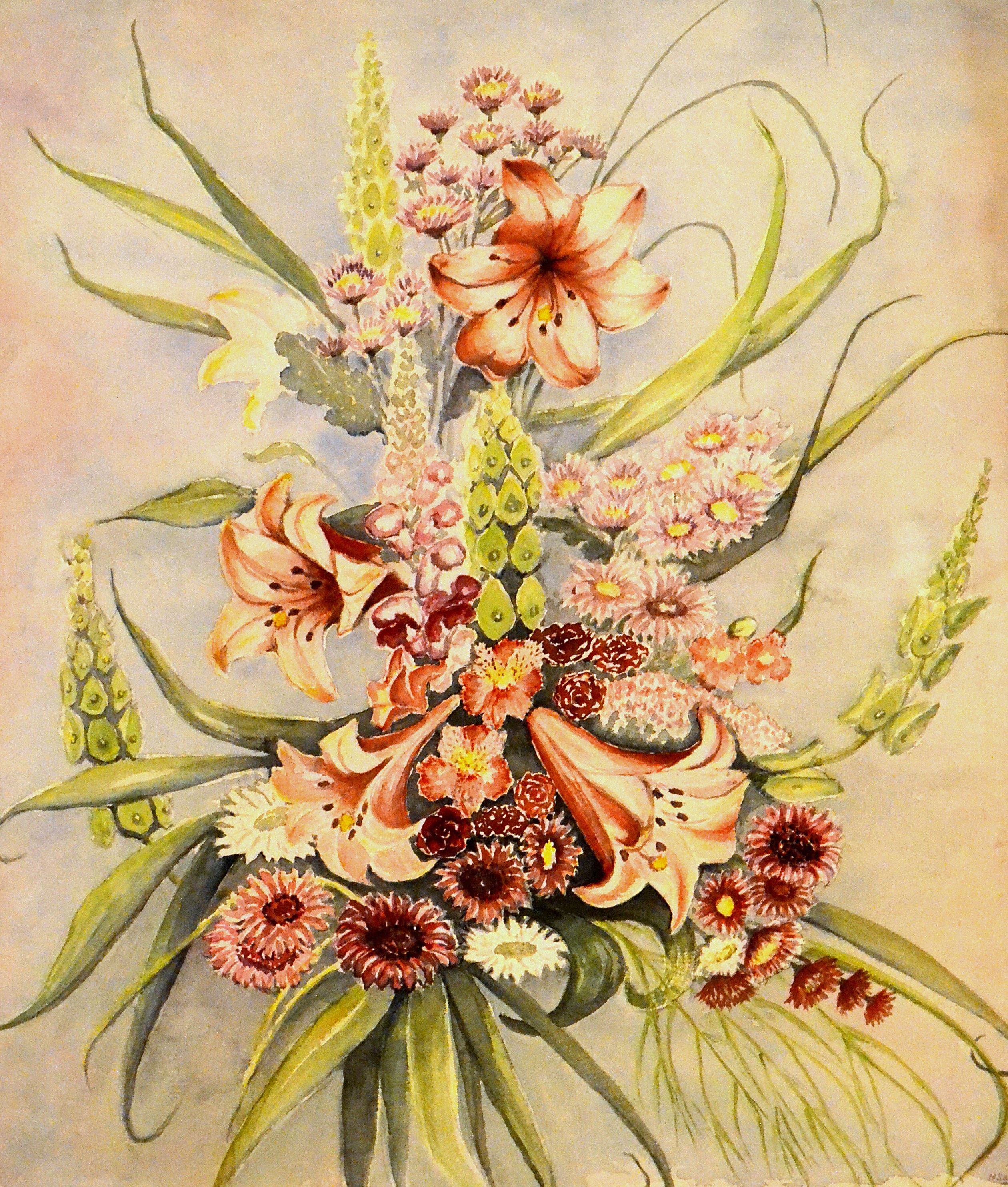 Expressieve compositie van diverse bloemen, onder andere amarylis en chrisanten.
