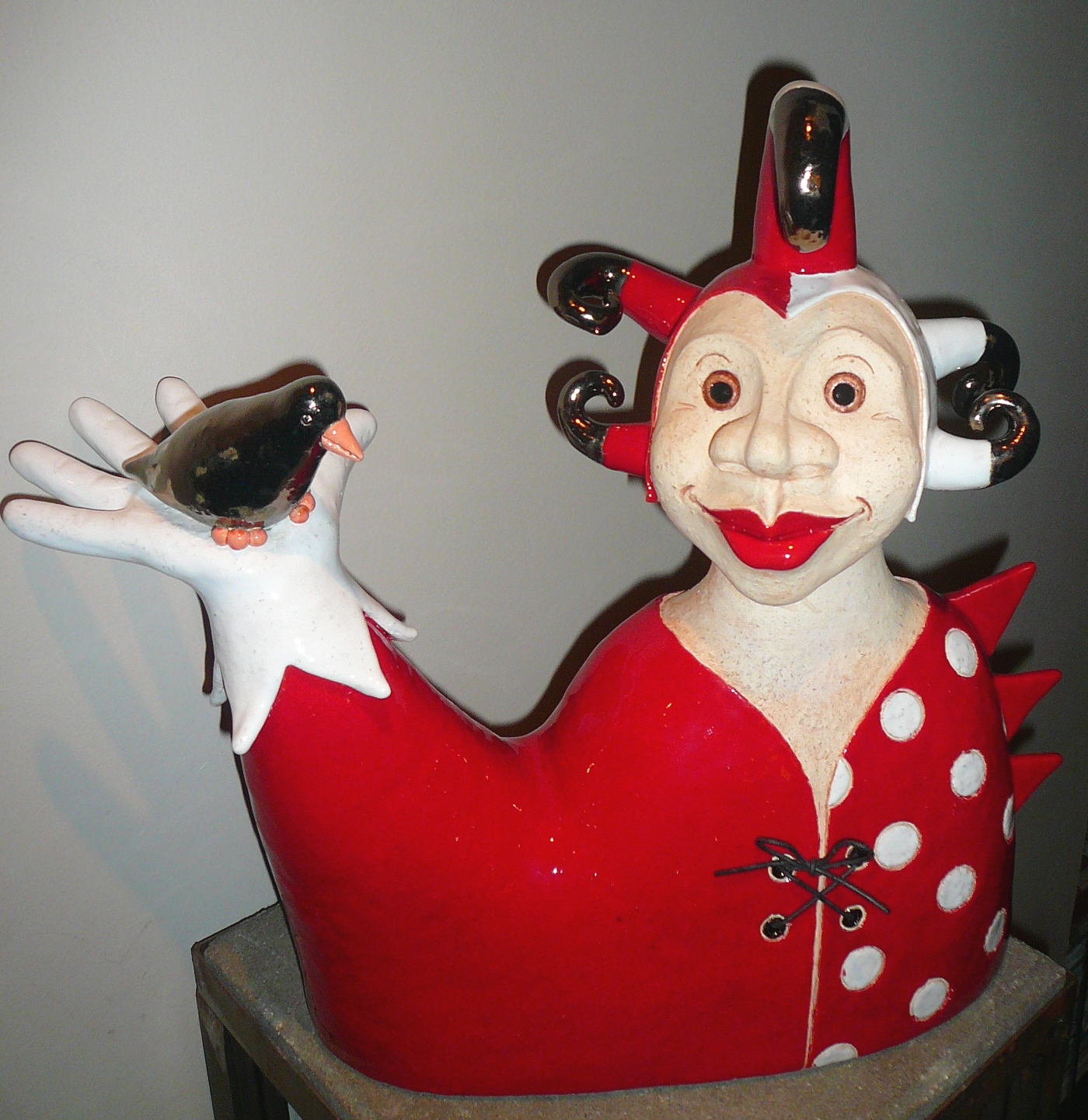 Grote rood-wit-bronskleurige nar met krullenmuts.