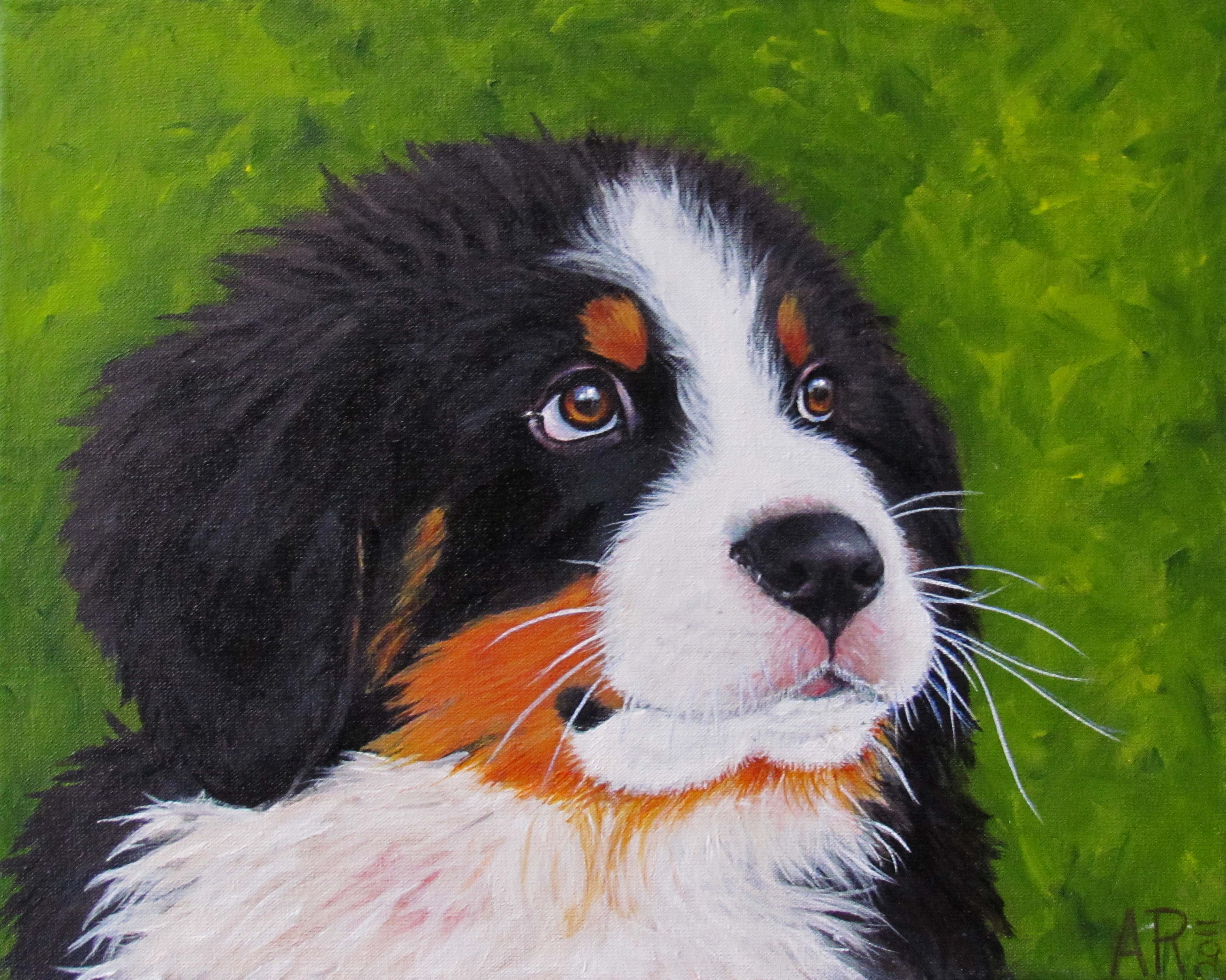 Schilderij Wit Zwart Acryl Groen Bruin Berner Sennen Dieren Painting Acrylic Hond Dog Dierportret Bernese