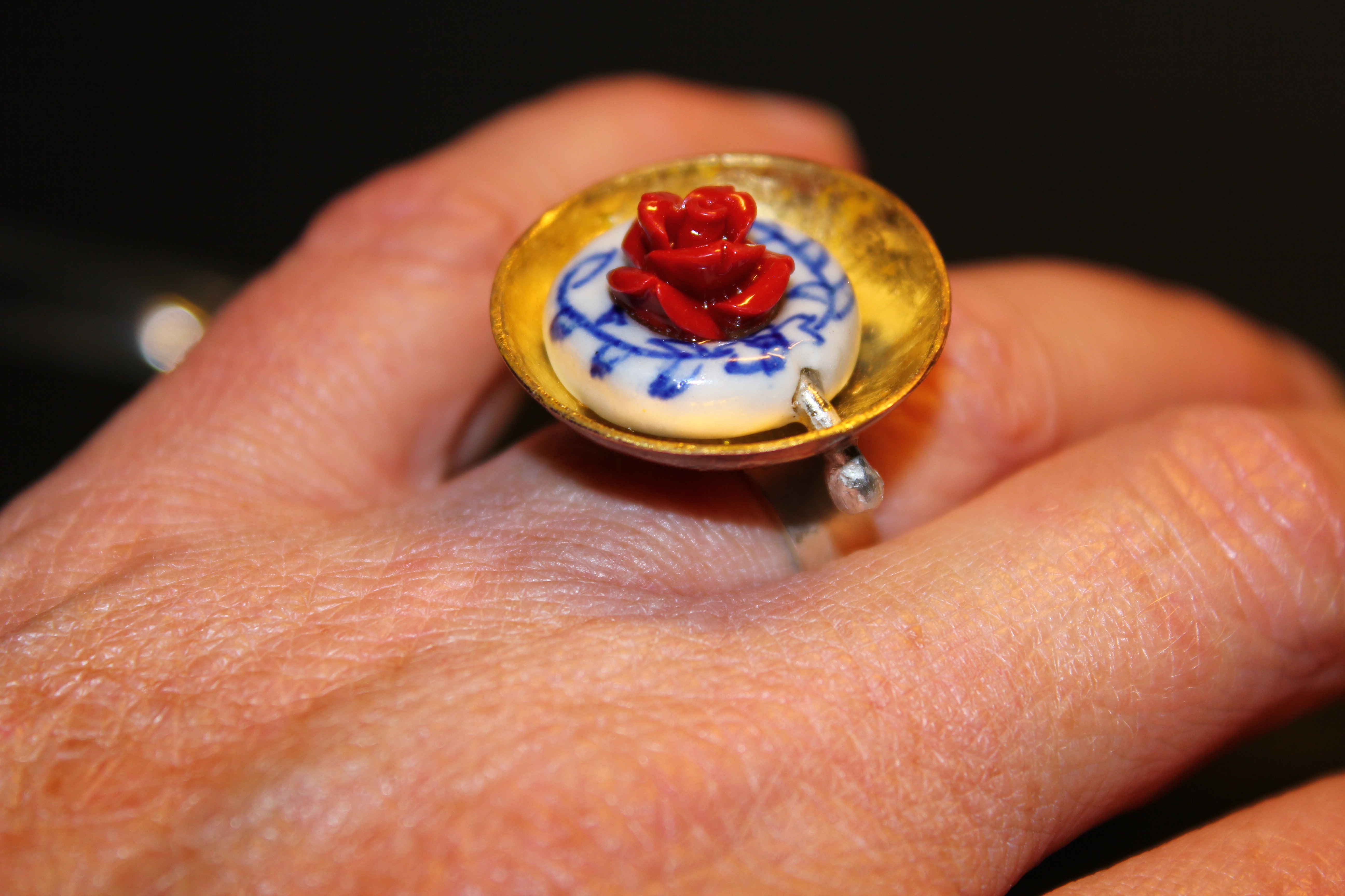 koraalrood roosje, op een ring van delfts blauw in een bladgouden kommetje. Verkocht Pijs: € 50,-