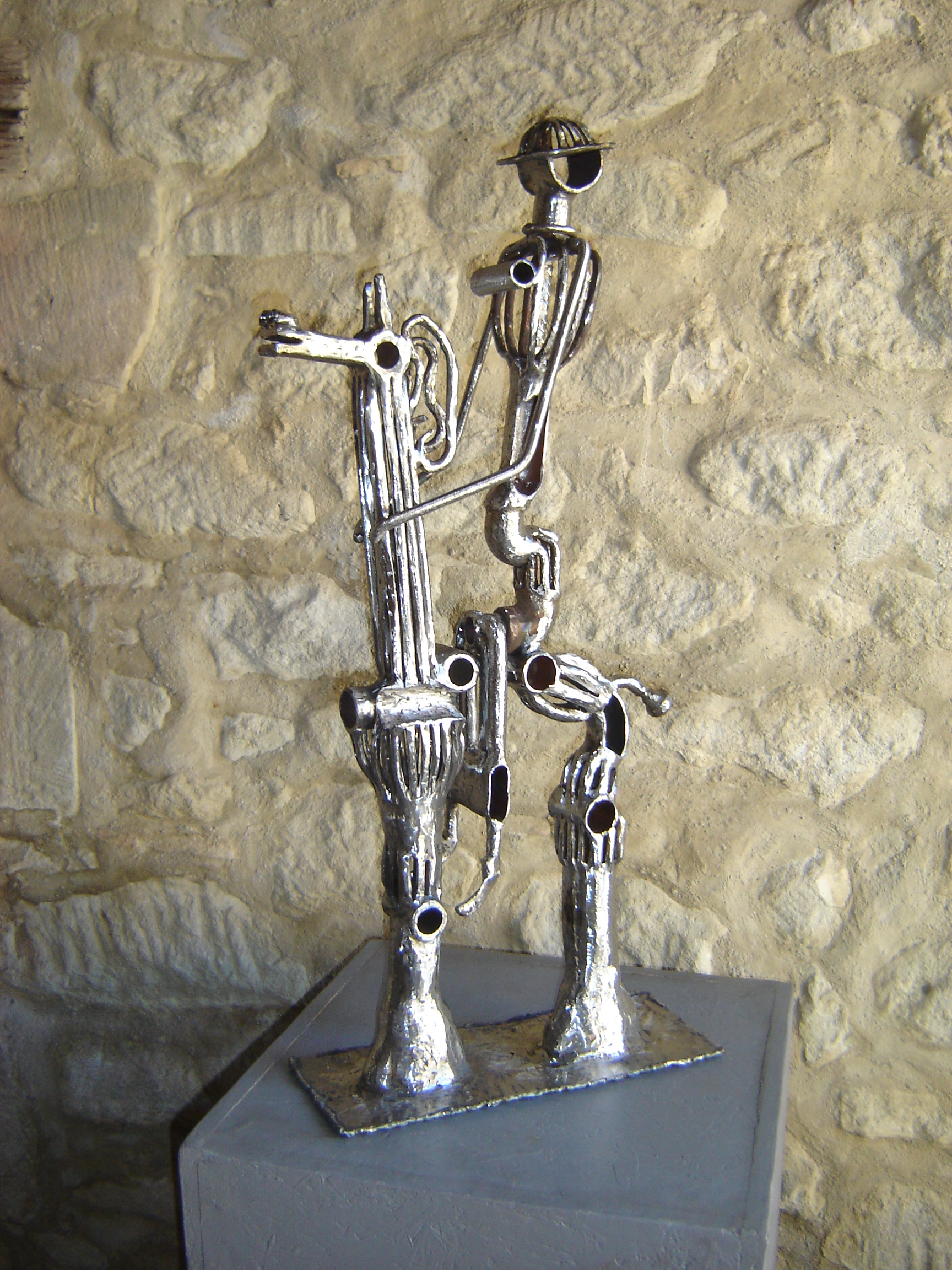 Dit werk is gemaakt van afvalijzer zoals stukjesbuis. Alle materialen vloeien in elkaar over en de ruiter en het paard vormen echt een eenheid.