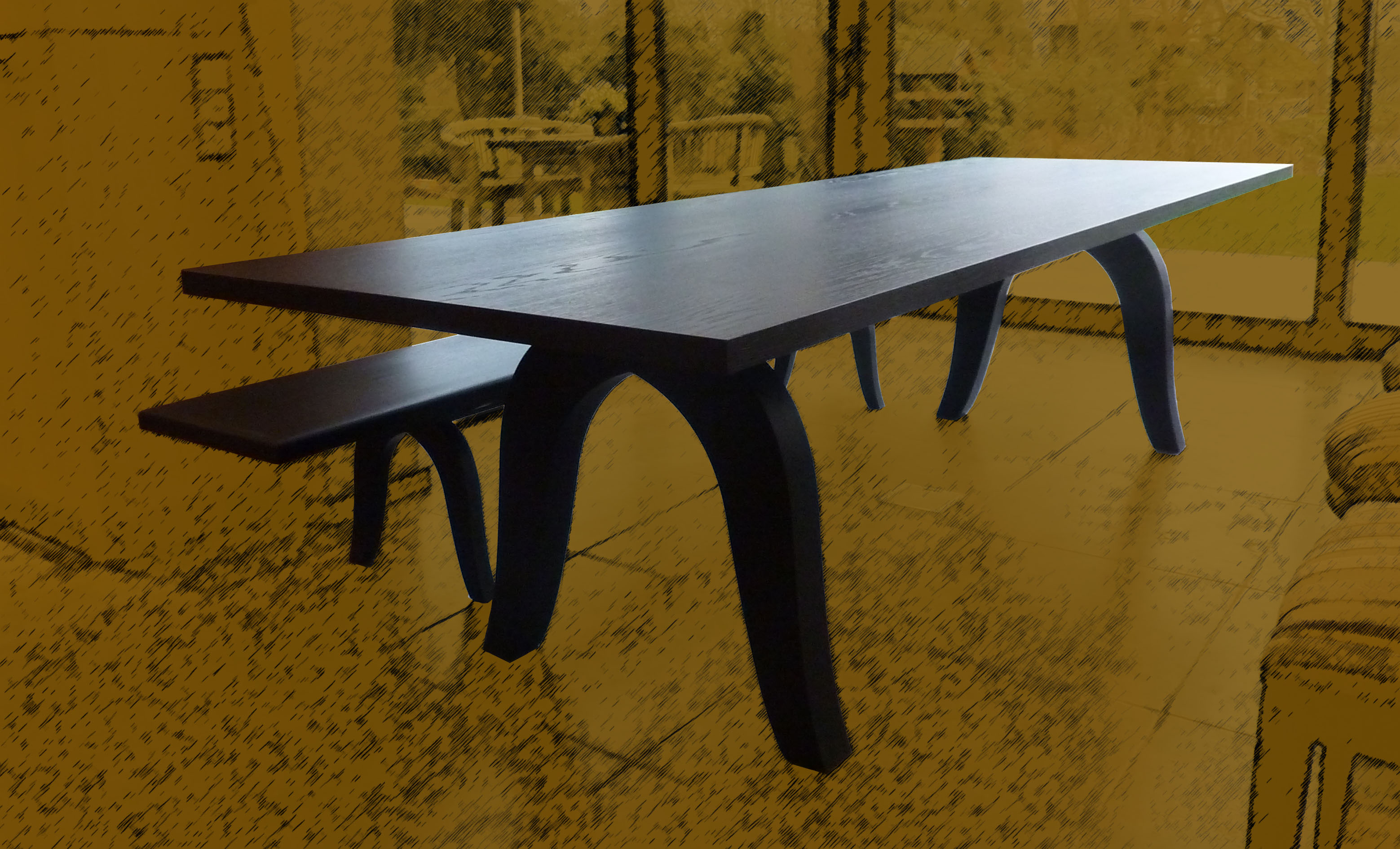 een nieuwe eettafel en bank voor de barones, zwart gebeitst eiken