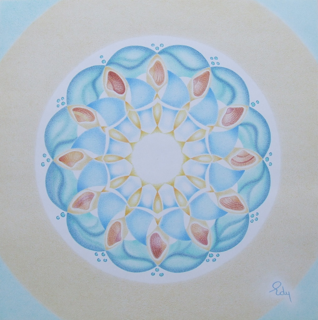 Edy combineert haar liefde voor kleuren en papier door blanco tekenvellen te vullen met in elkaar overvloeiende kleuren en mooie vormen. Vaak is een mandala de basis.