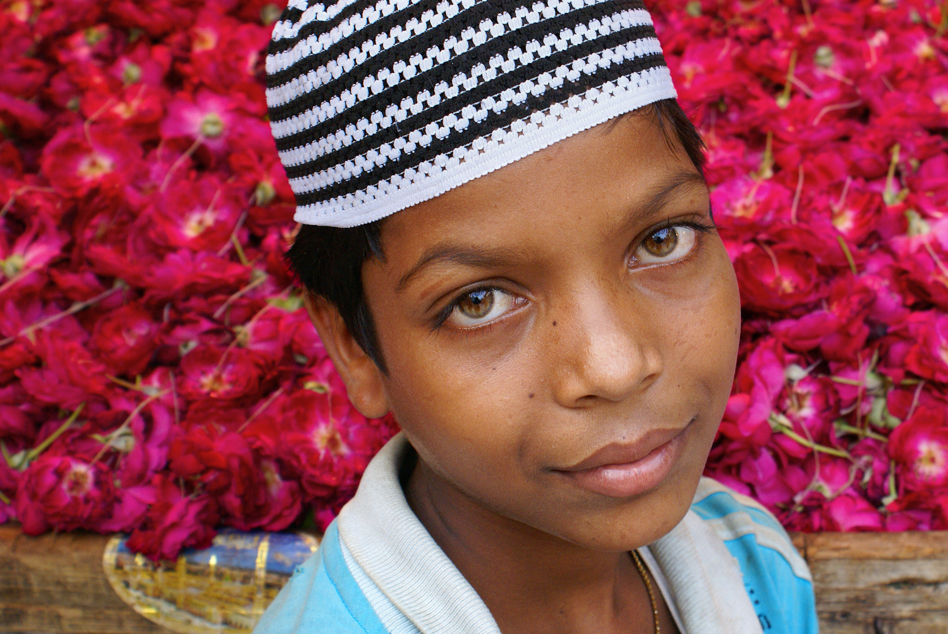 Portret van een rozenblaadjes verkoper, Nizzamuddin Dargah, Delhi, India.