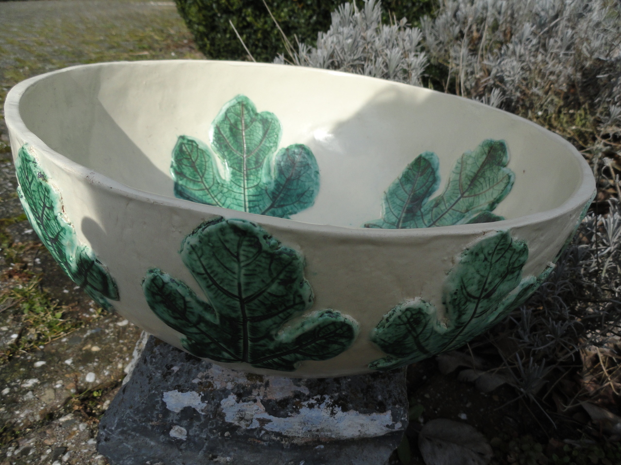 Geboetseerde ronde diepe schaal gedcoreerd zowel aan de binnenkant als aan de buitenkant met vijgen bladjes. De vijgenbladjes zijn in relief op de schaal aangebracht en met koperoxide ingekleurd. De schaal is met transparante zijdematte glazuur gespoten en op 1060 graden in de elektriesche oven gebakken.