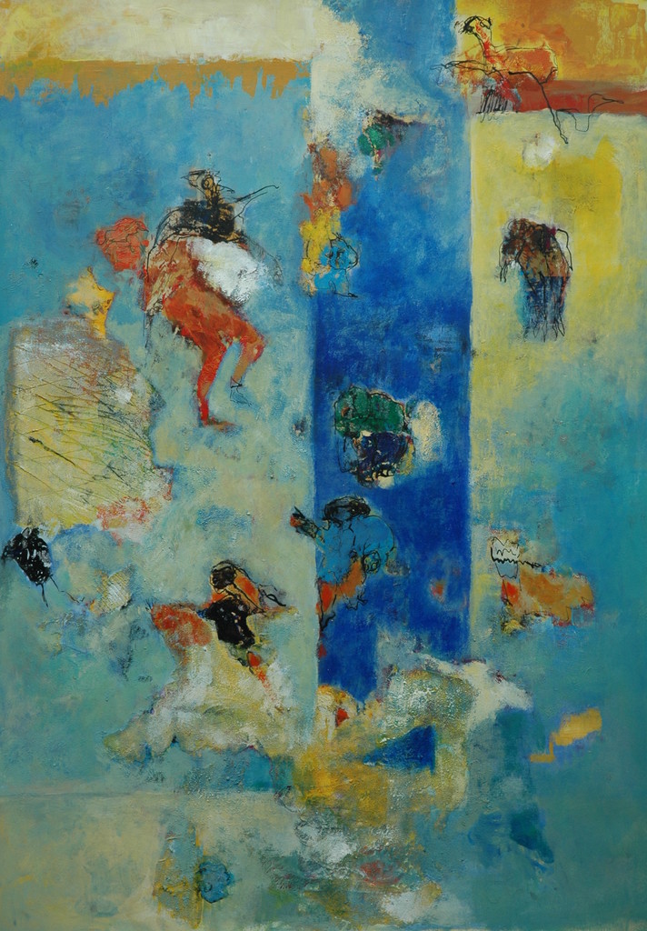 Vallen en stijgen. Acryl, oostindische inkt en zand