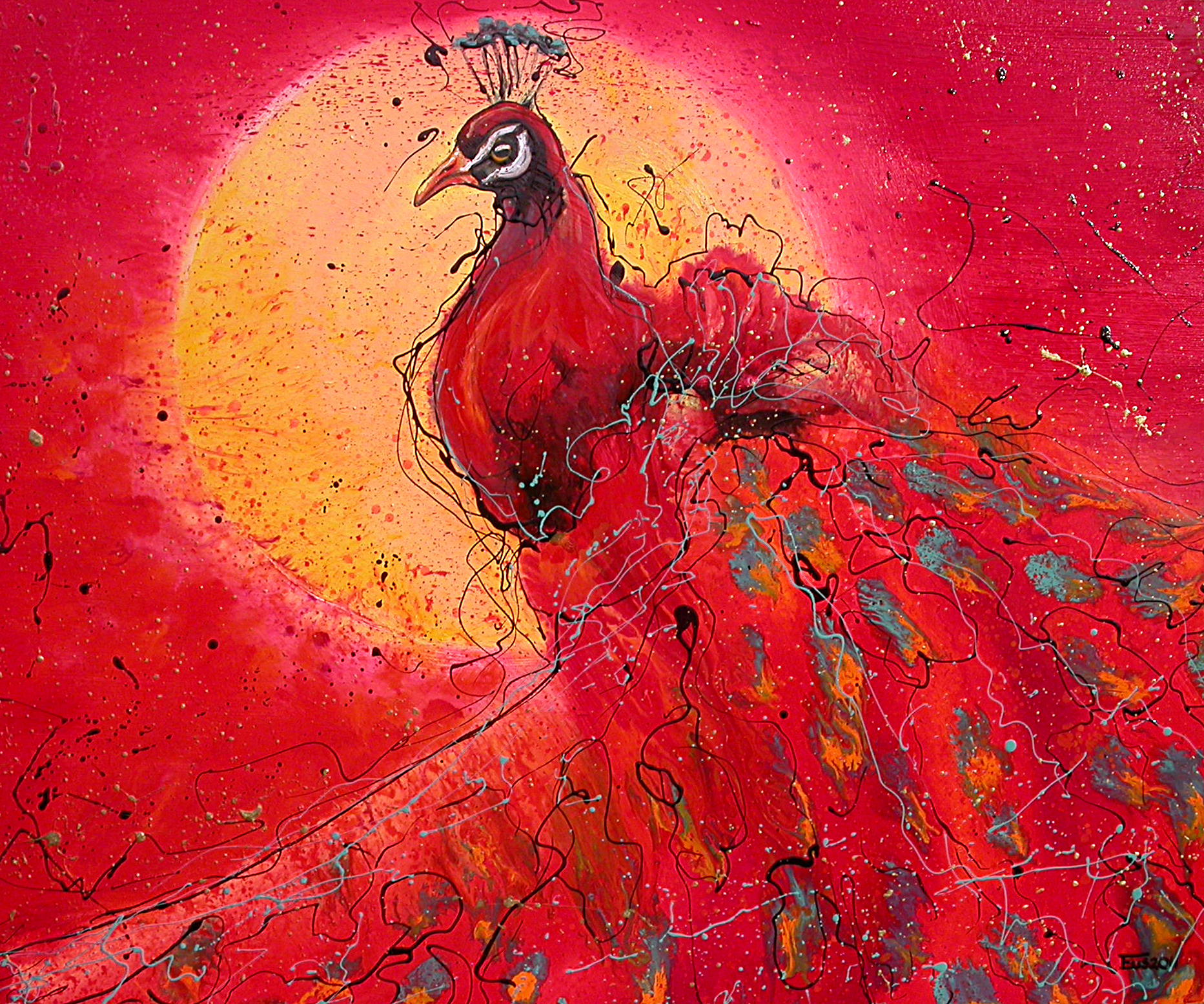 Rood Vogel Rode Sunset Zonsondergang Red Bird Pauw Erlinde Ufkes Stephanus Animalart Dierenkunst Peacock Vogelkunst Kippenkunst Birdart Chickensart Vogelschilderijen Kippenschilderijen Birdpaintings Chickenpaintings