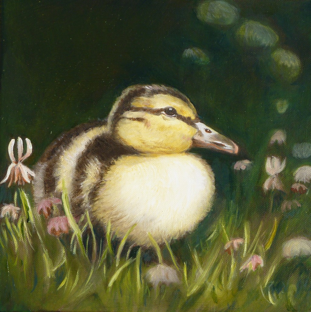 Dit schattige eendje voelt zich prima in het gras, tussen de bloemen. Geschilderd volgens de techniek van de oude meesters.