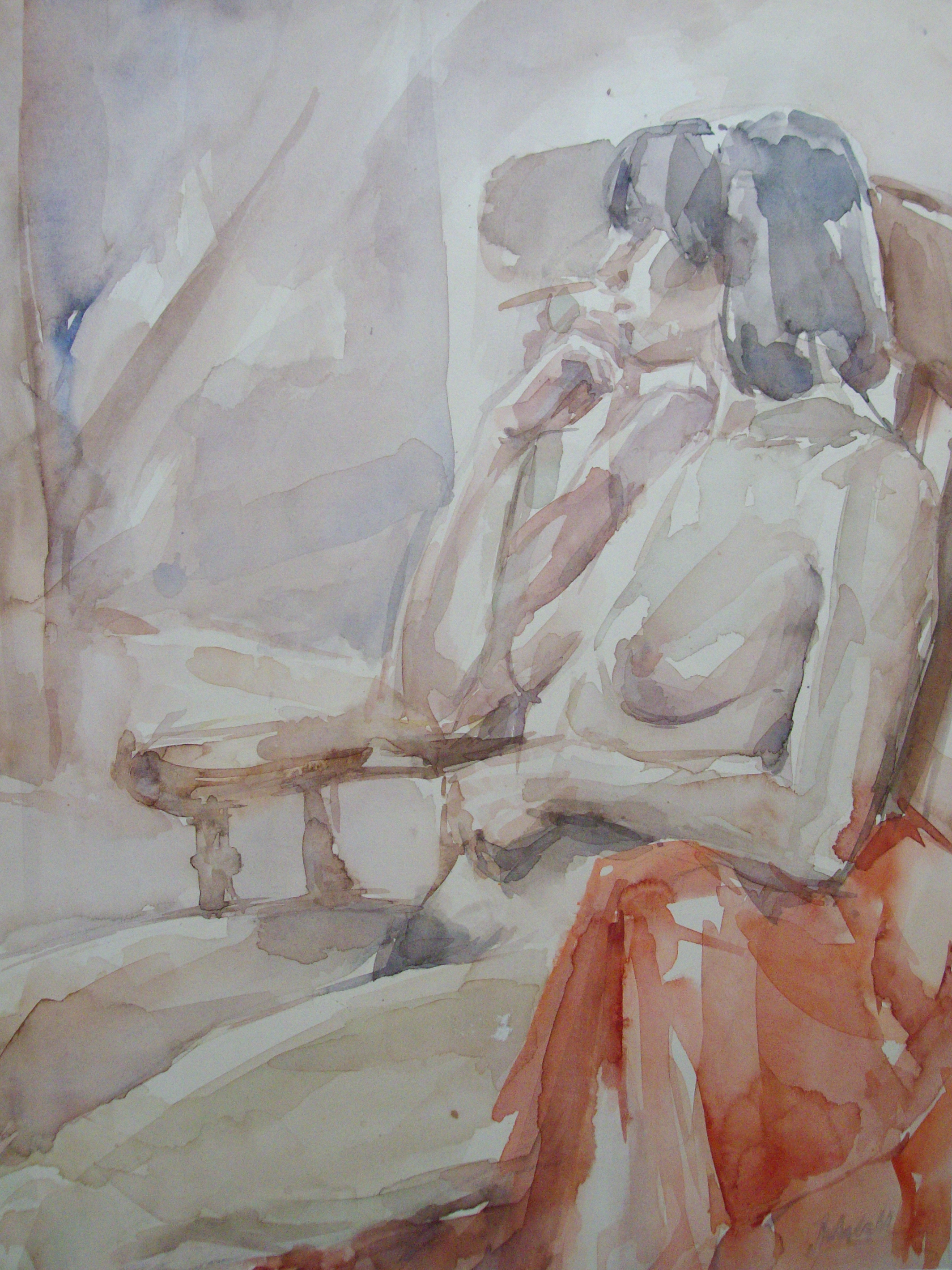 Naakt model in helder daglicht, zittend in stoel, met rode lap.