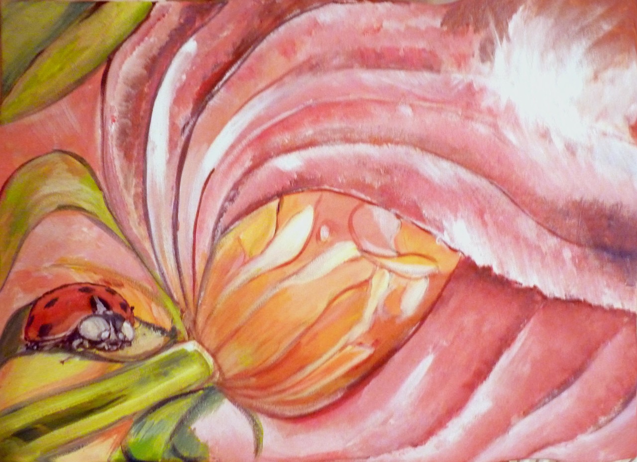 a ladybug almost inside a tulip, splasing coulors