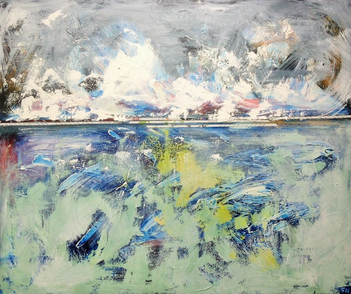 Wat zie jij achter de horizon? Mixed media en olieverf op doek.