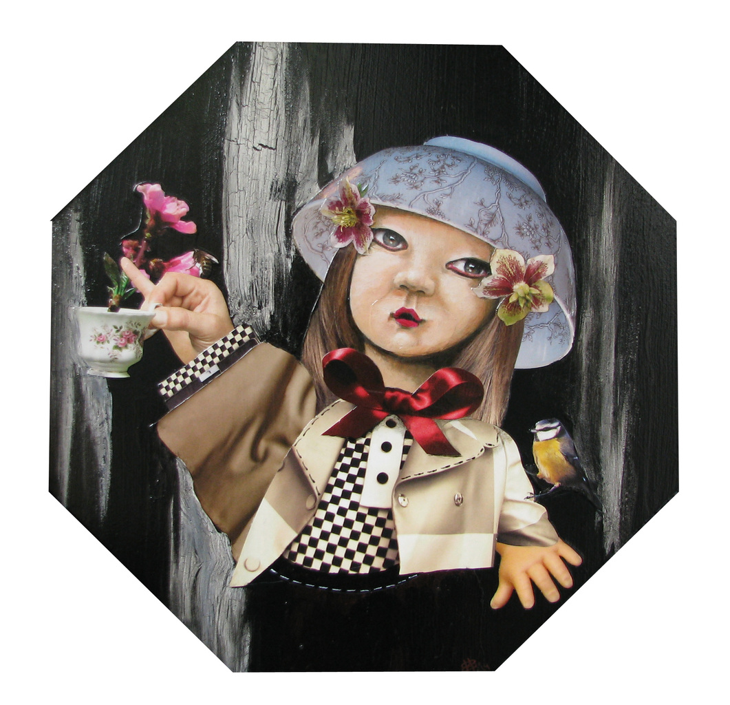 Oosters meisje met op haar arm een pimpelmeesje. In haar hand een theekopje met bloesem en een bij.