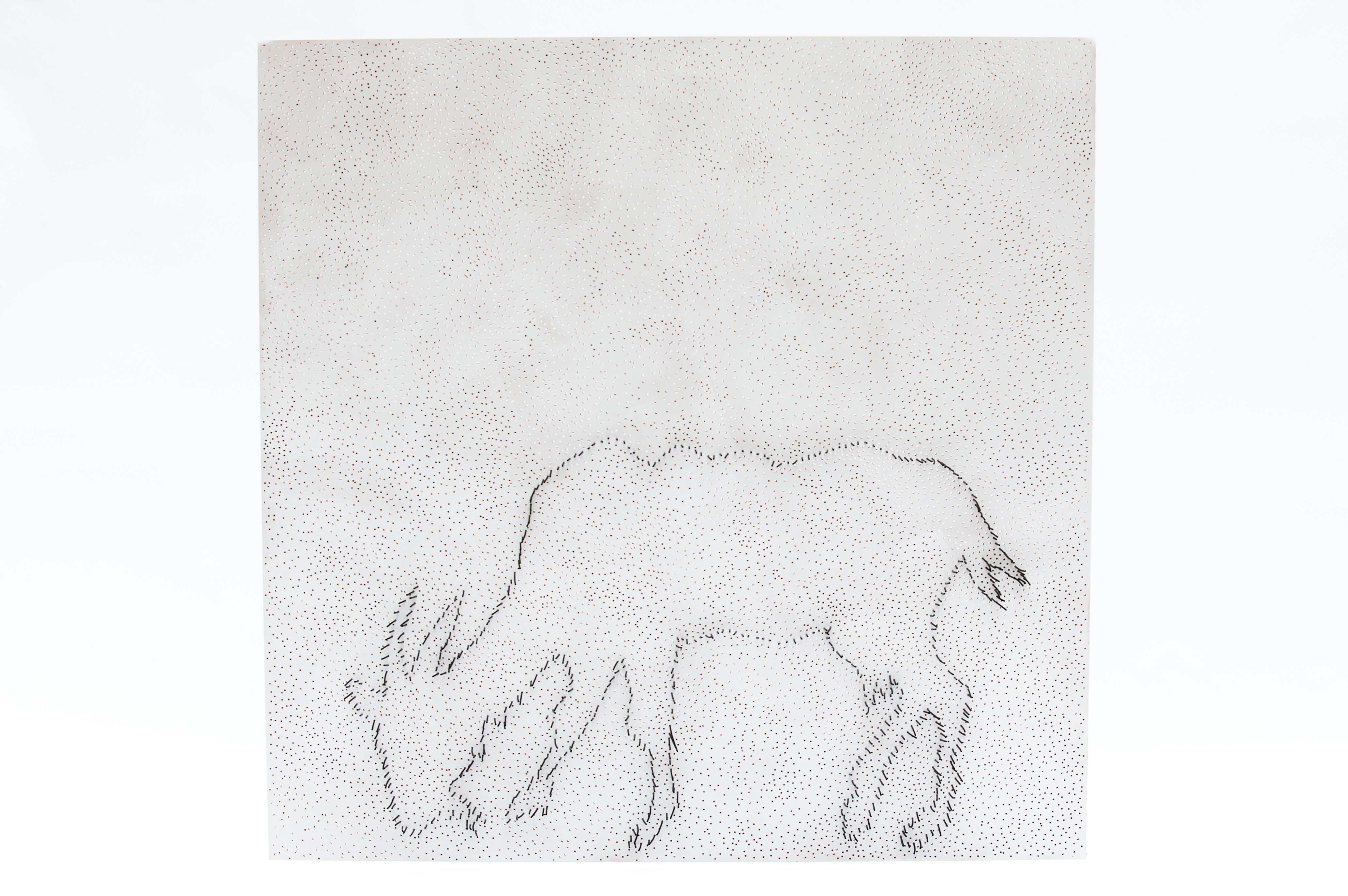 Honderden gaatjes in een houten plaat. De contour van de bok wordt zichtbaar gemaakt met rubber tubes in de gaatjes.
