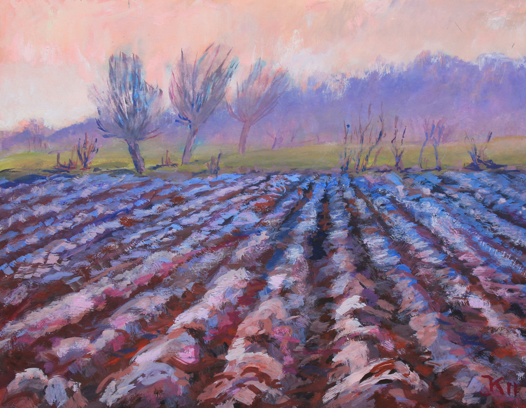 nevelige sfeer en verhuld zonlicht reflekties in blauw violet rood en oramje op de ploegsnede. rust vrede verdieping