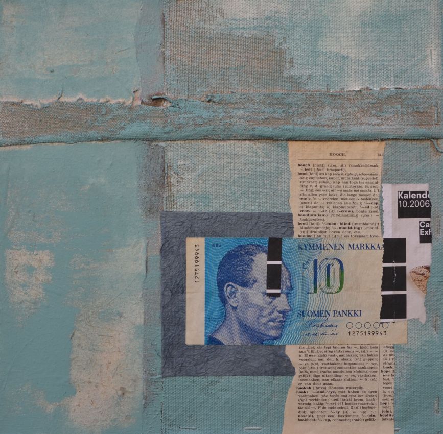 Collage en acryl op 3D doek. Materiaal: papier, jute, Fins geldbiljet, woordenboek, acryl.