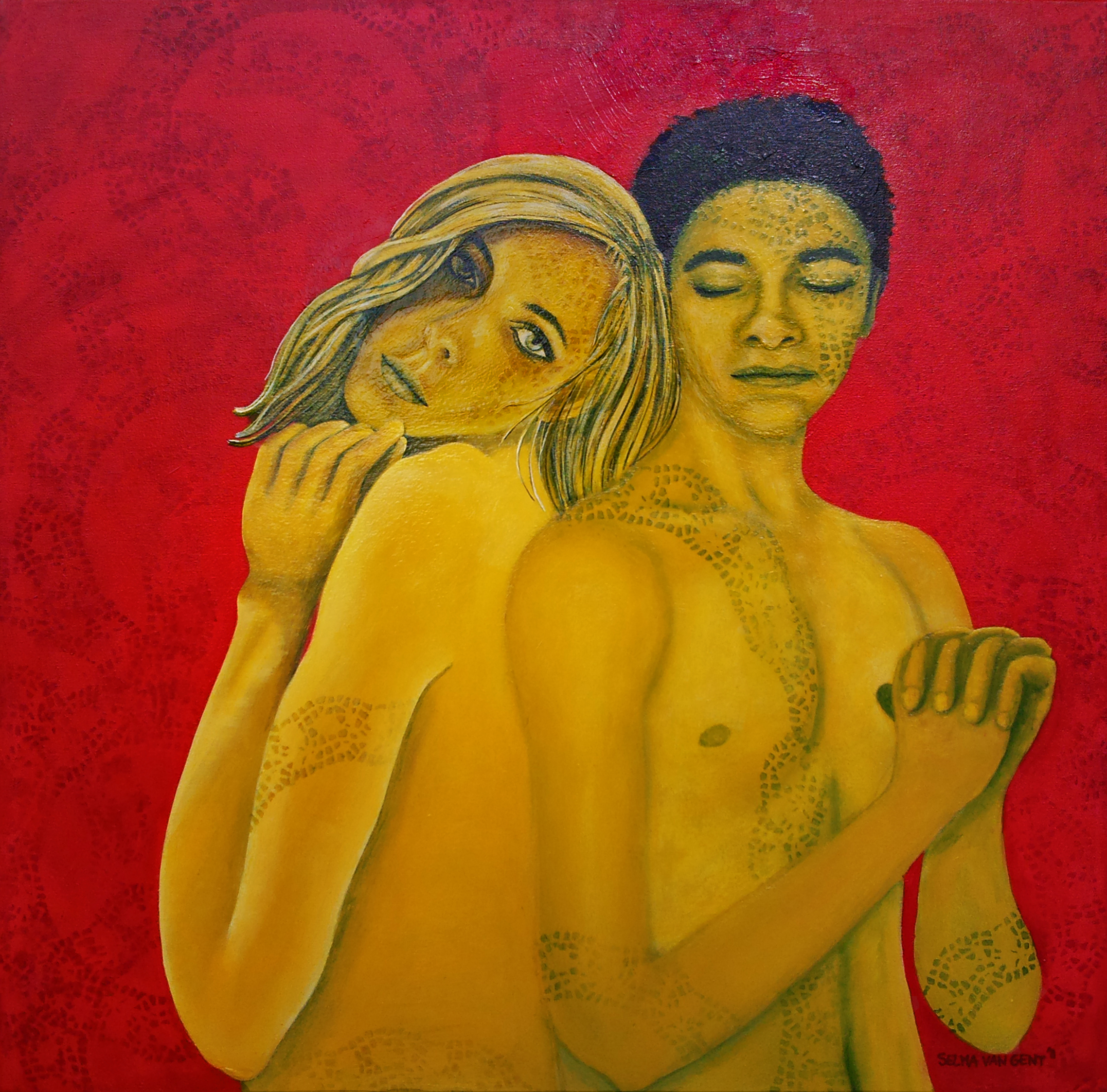 Man Vrouw Rood Geel Bidden Hopen Liefde Portret Samen Omhelsen Red Yellow Hoping Huging Pray Love Woman Men