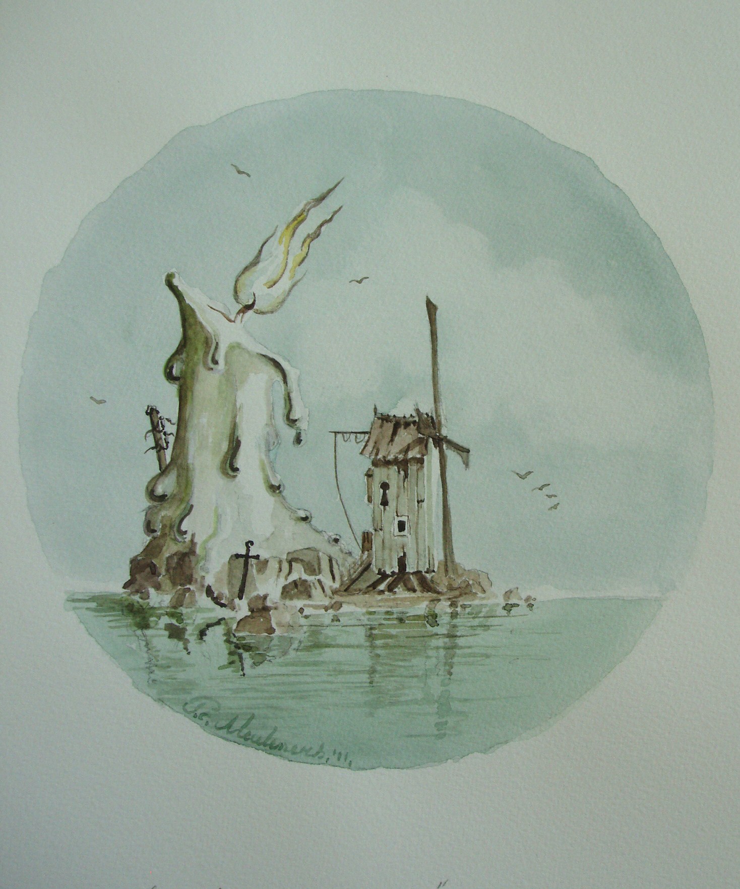 Zee Molen Kaars Eiland Aquarel Rond Papier Realisme Fantasie Romantiek Watercolour