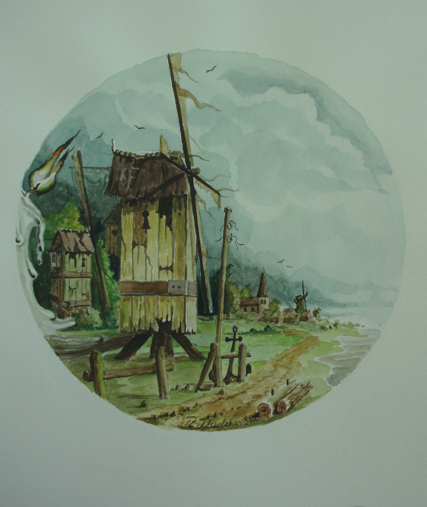 Ketenen Molen Kaars Papier Aquarel Rond Realisme Fantasie Romantiek Landschap