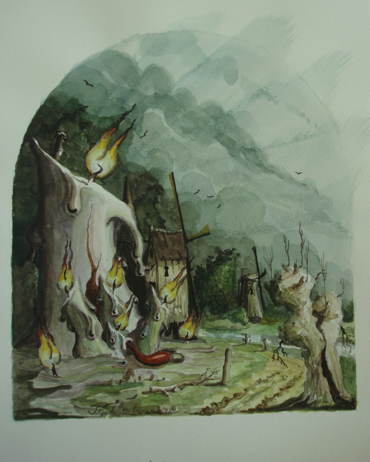Kaars Molen Landschap Geboorte Aquarel Papier Rond Realisme Fantasie Romantiek
