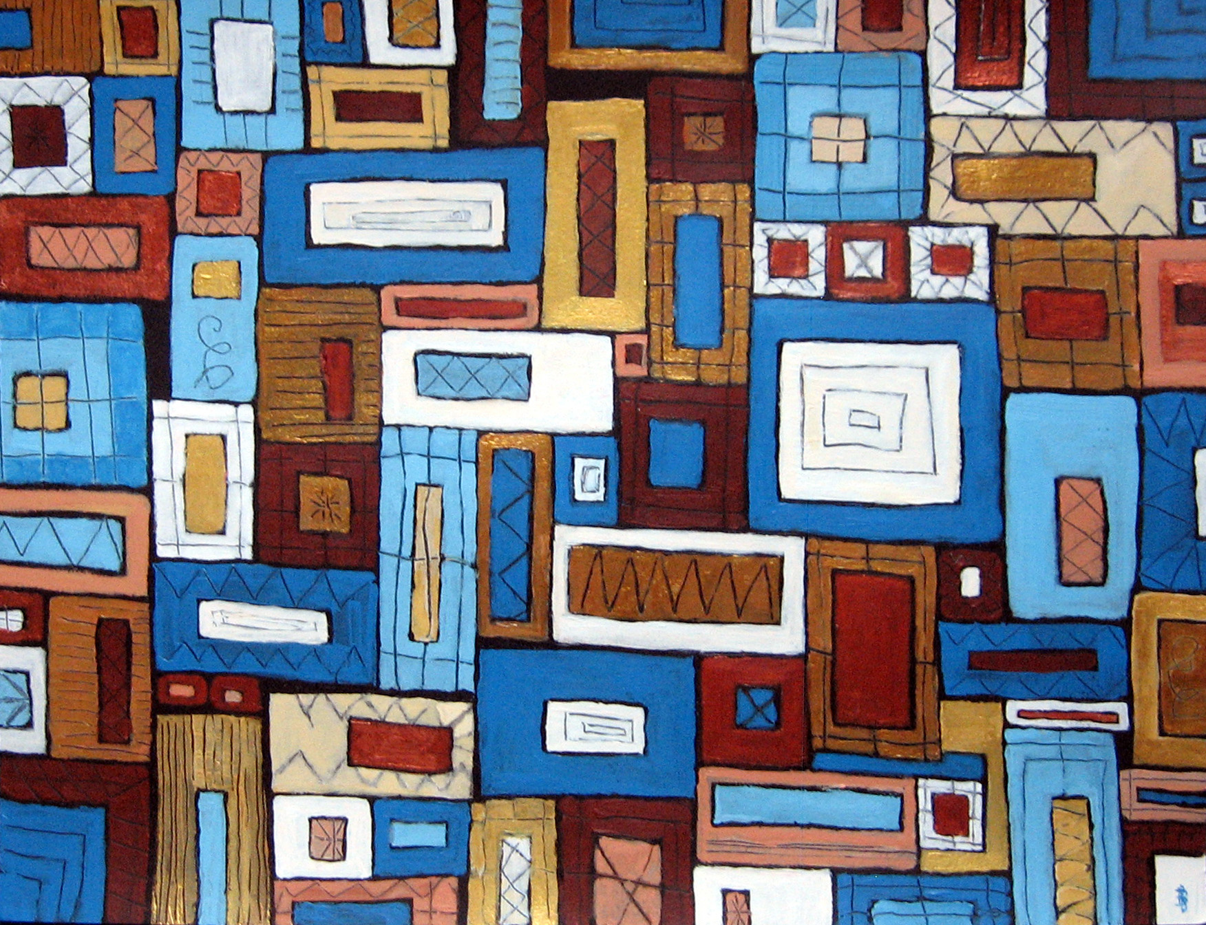 Abstract studie 11. Opdracht van een vlakverdeling met rechthoeken en vierkanten, a la prima en met sgrafito versieringen. Naar aanleiding van opdracht cursus R. van Vliet.