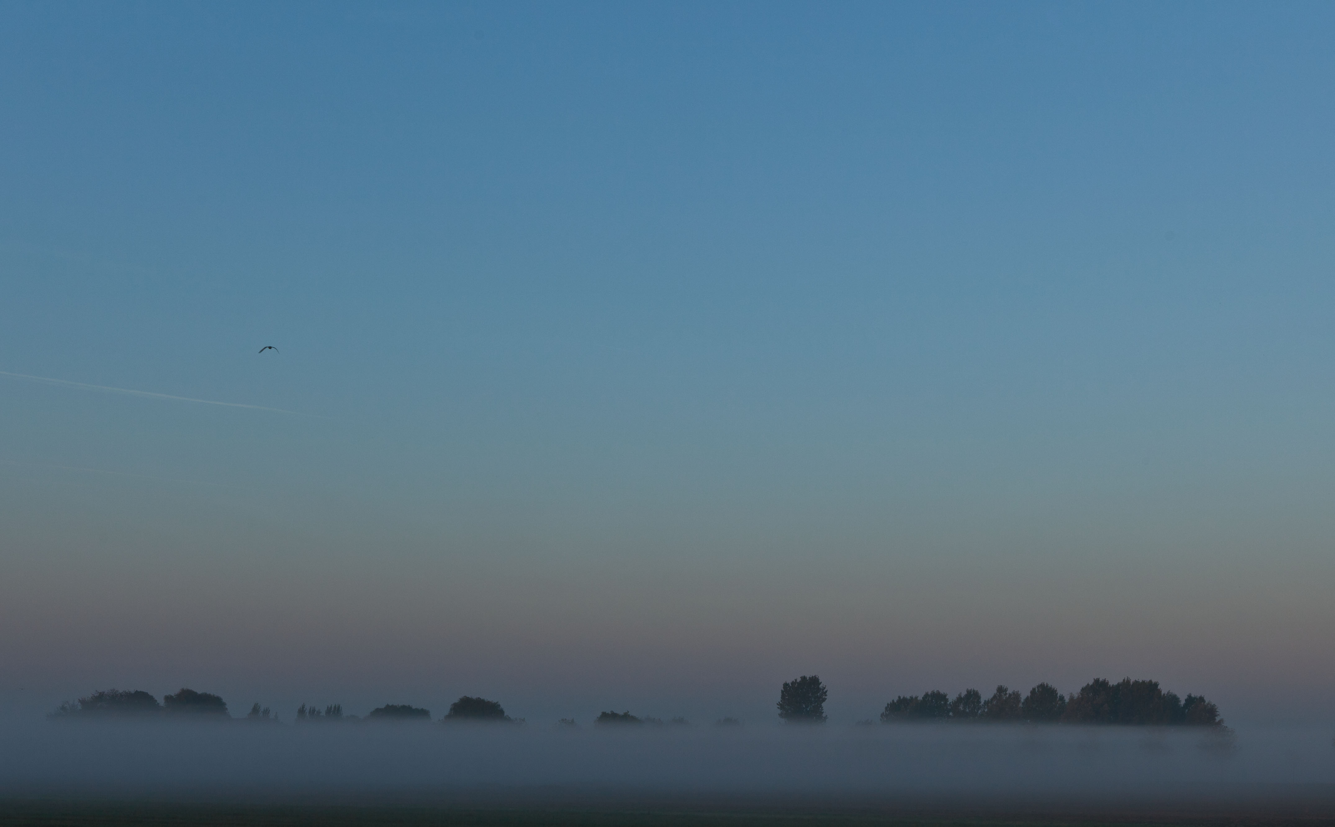 De ochtendmist haalt een verfstreep door de bomenrij en schildert een geabstraheerd gekleurd landschap.