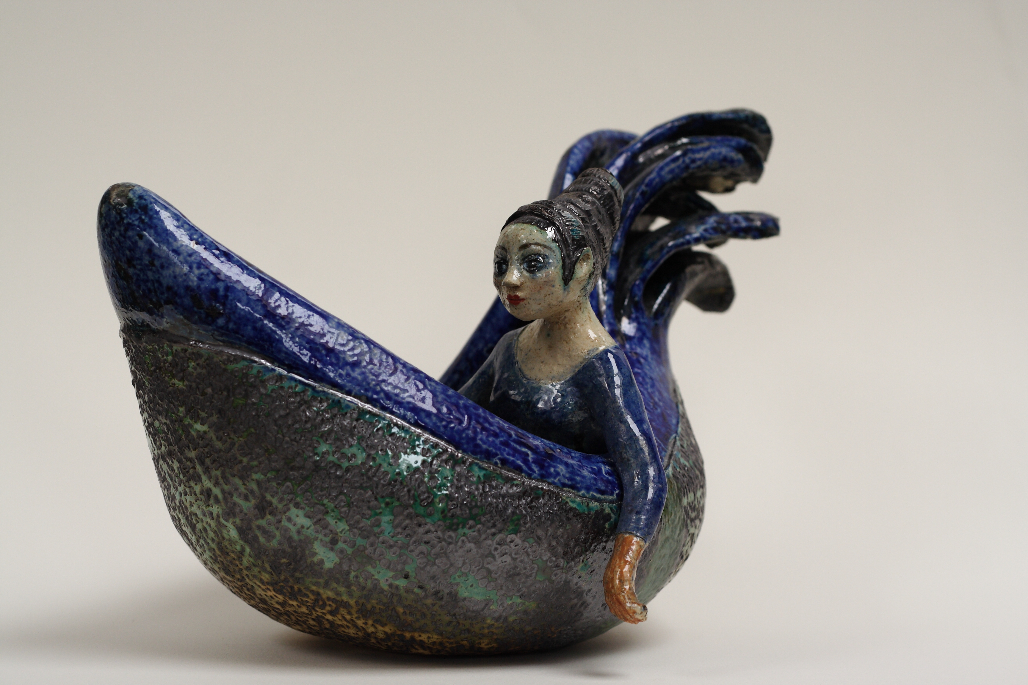 Cecile maakt keramische beelden, potten, dozen en tegels en geluksvisjes. Koppen met hoofdtooi of badmuts. Sprookjesachtig en kleurrijk geglazuurd. Cecile ter Borgh is lid van de SKNH en heeft werk in stock bij Galerie Stam in Amsterdam.