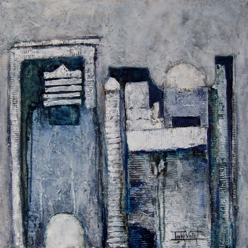 Materieschilderij in acryl op linnen. Voor het reliëf zijn materialen gebruikt zoals: stof, papier, karton, zand enz.