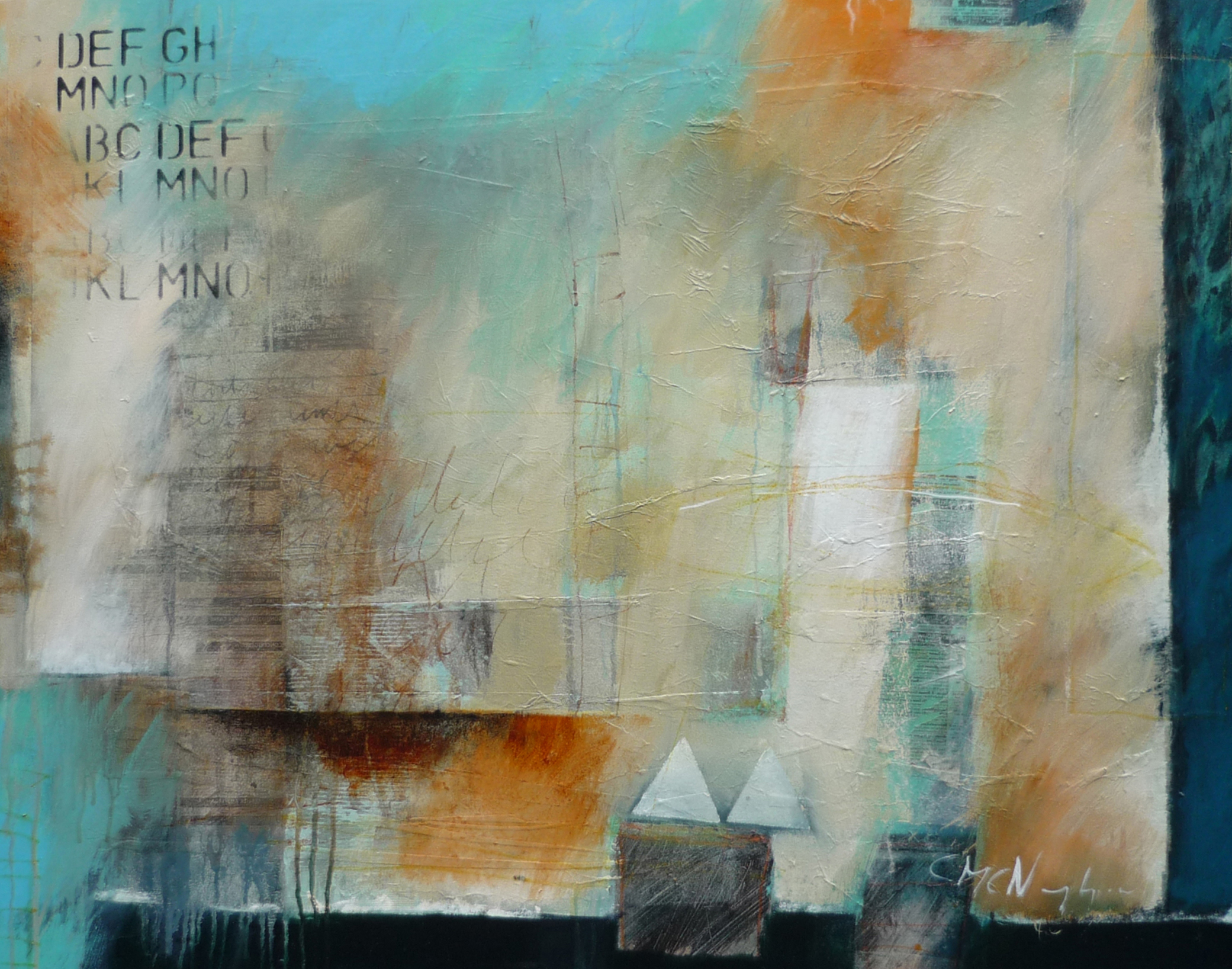 Het nieuws komt elke dag bij ons binnen . Soms heftig ,maar altijd aanwezig .Op dit schilderij heb ik de transfers van krantenartikelen en letters van de krant als ritme in het schilderij gebruikt. Dit schilderij heeft verder voornamelijk abstracte elementen.