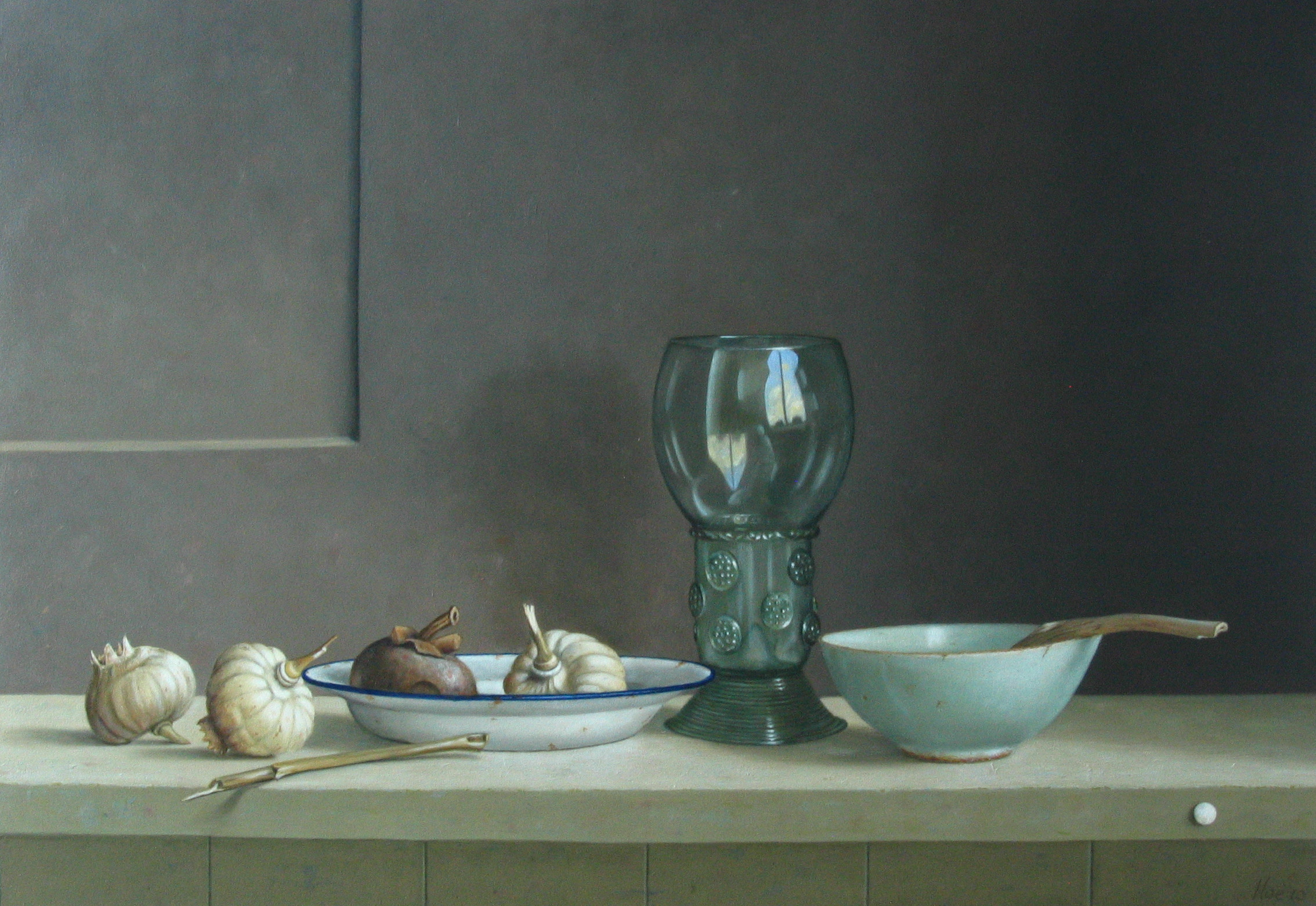 Het stilleven is opgebouwd rondom enkele oude gebruiksvoorwerpen, zoals een roemer, chinese kom en een antiek bordje.