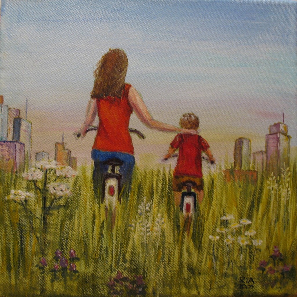 Fietsen naar de stad. Zorgzaam leidt de moeder haar kind naar de grote stad.