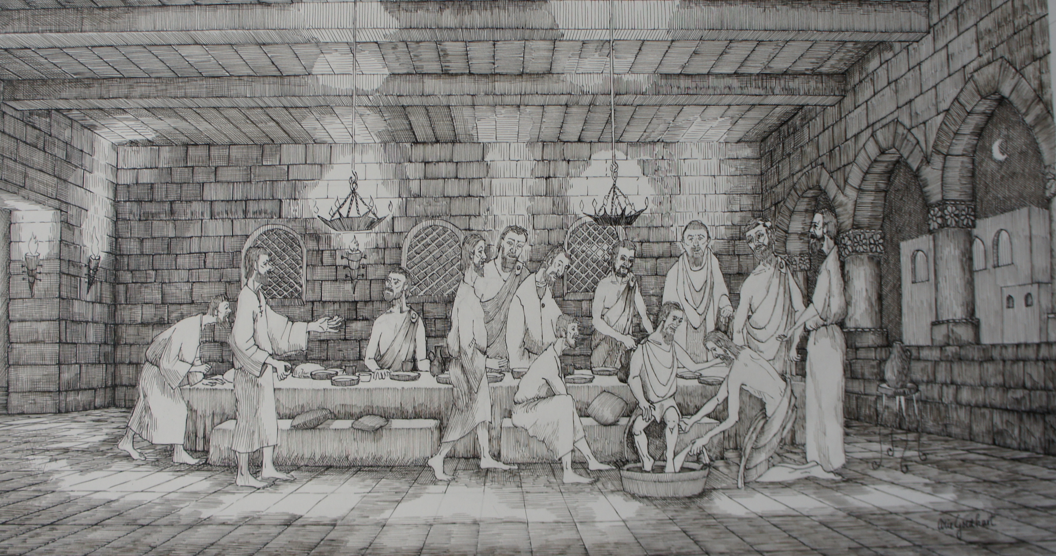 een fantasie voorstellen,Hoe Jezus als minste onder de broeders de voeten waste van al de discipelen voor het laatste avondmaal .