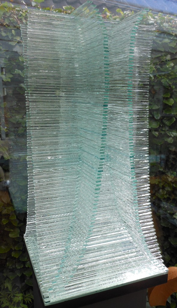 de opstapeling van de reepjes glas symboliseren de hoeveelheid meningen die samen de toren van babeld vormen. Deze staat weer voor de storing in communicatie.