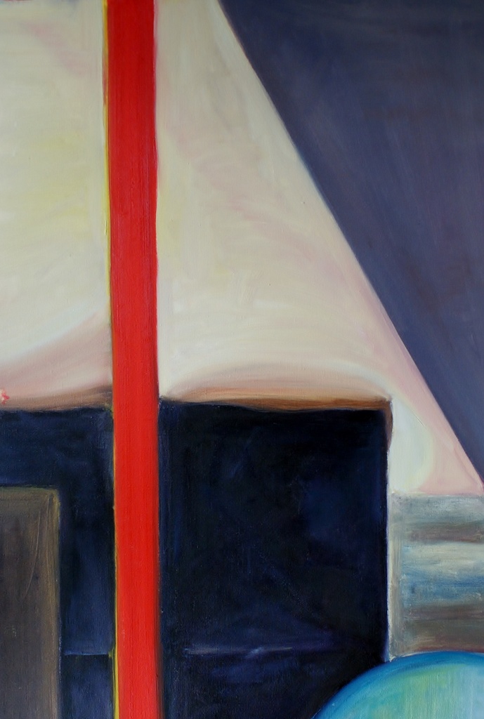 Vlakverdelling van geometrische vormen. Rustige kleuren met daarin een pittig rood. Hel geheel straalt een bepaalde rust uit door het kleurgebruik en de vlakverdeling.