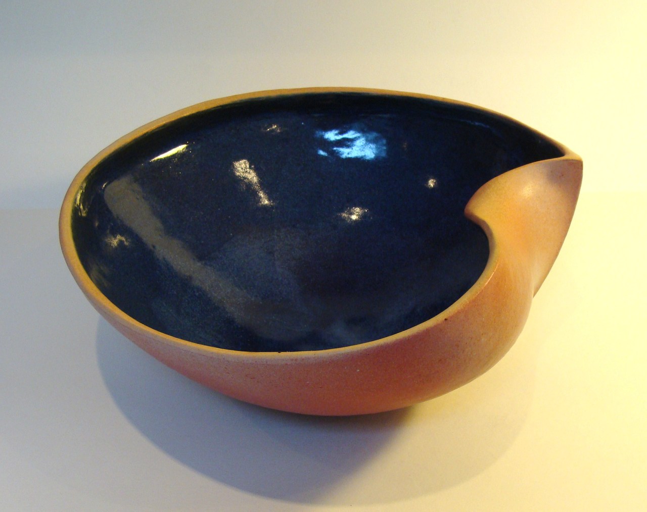 Organisch gevormde schaal, geïnspireerd op wind, water, schelpen. Matgekleurde buitenkant, prachtige stralend blauwe binnenkant, zodat een echte binnenwereld is ontstaan.
