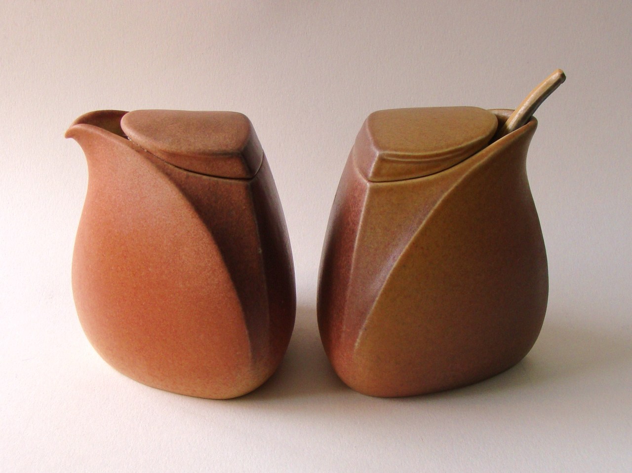 bijzonder gevormd roomstel, melkkannetje en suikerpot allebei met deksel, beweging in de richting van de opening