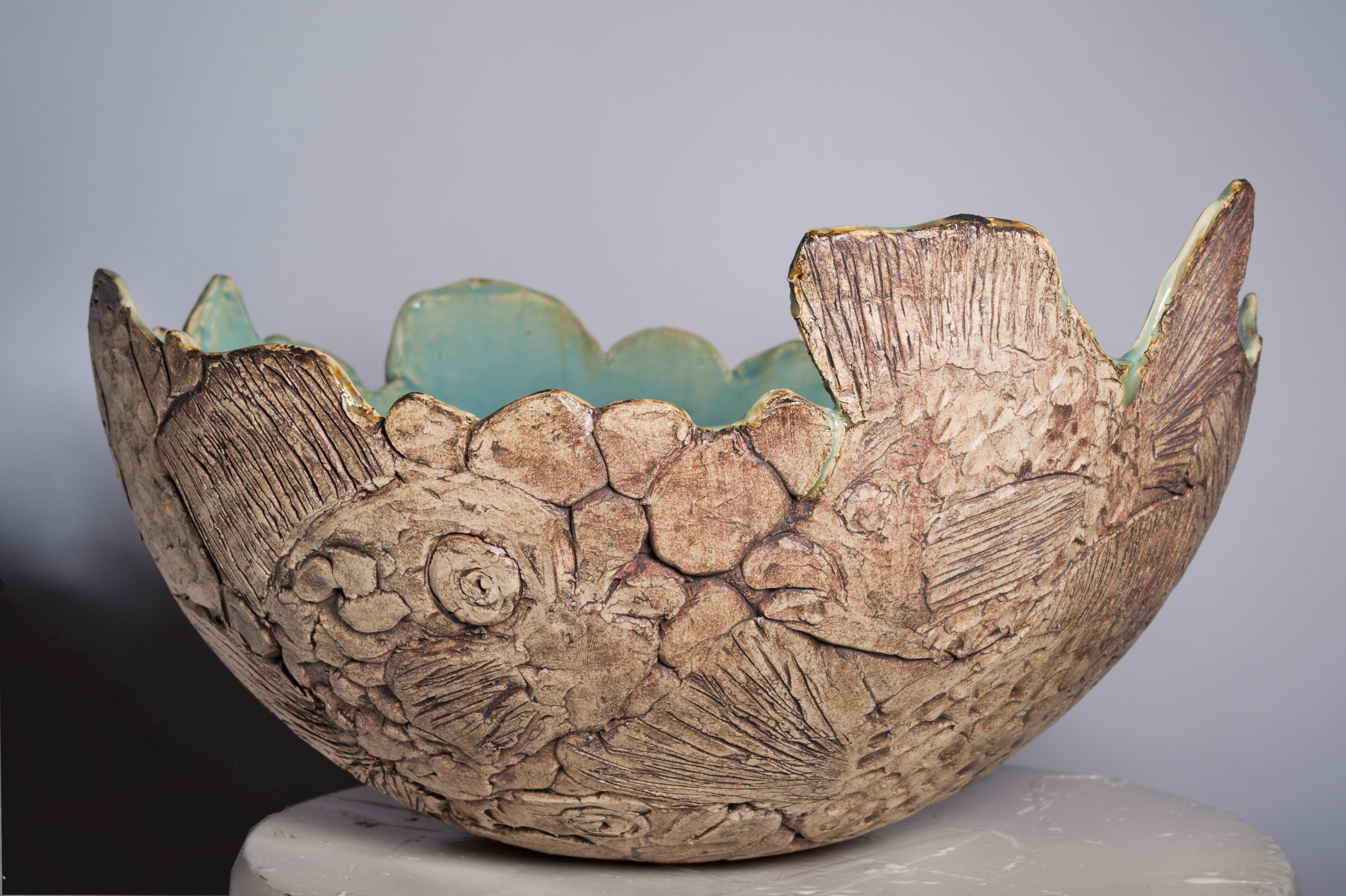 grote schaal met vissen,aan de binnenkant glanzend blauw geglazuurd en aan de buitenkant een ruw uiterlijk.