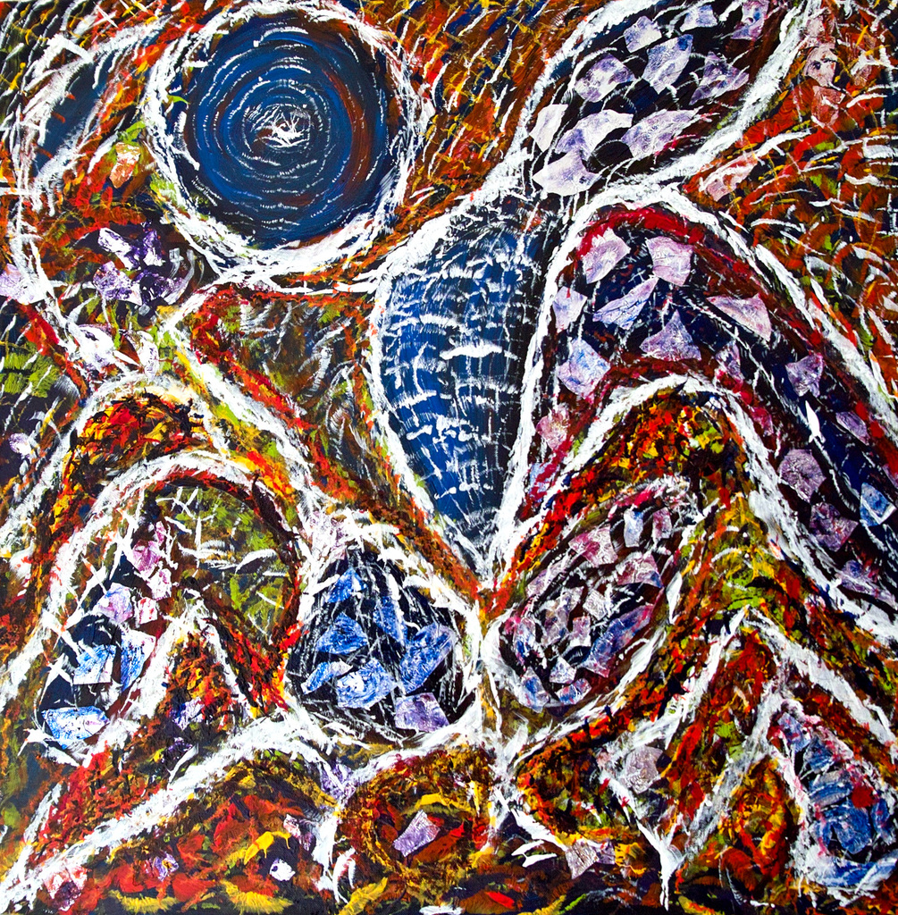 Geinspireerd op Aboriginal kunst. Acryl verf gecombineerd met aluminiumfolie en verschillende kruiden en thee.