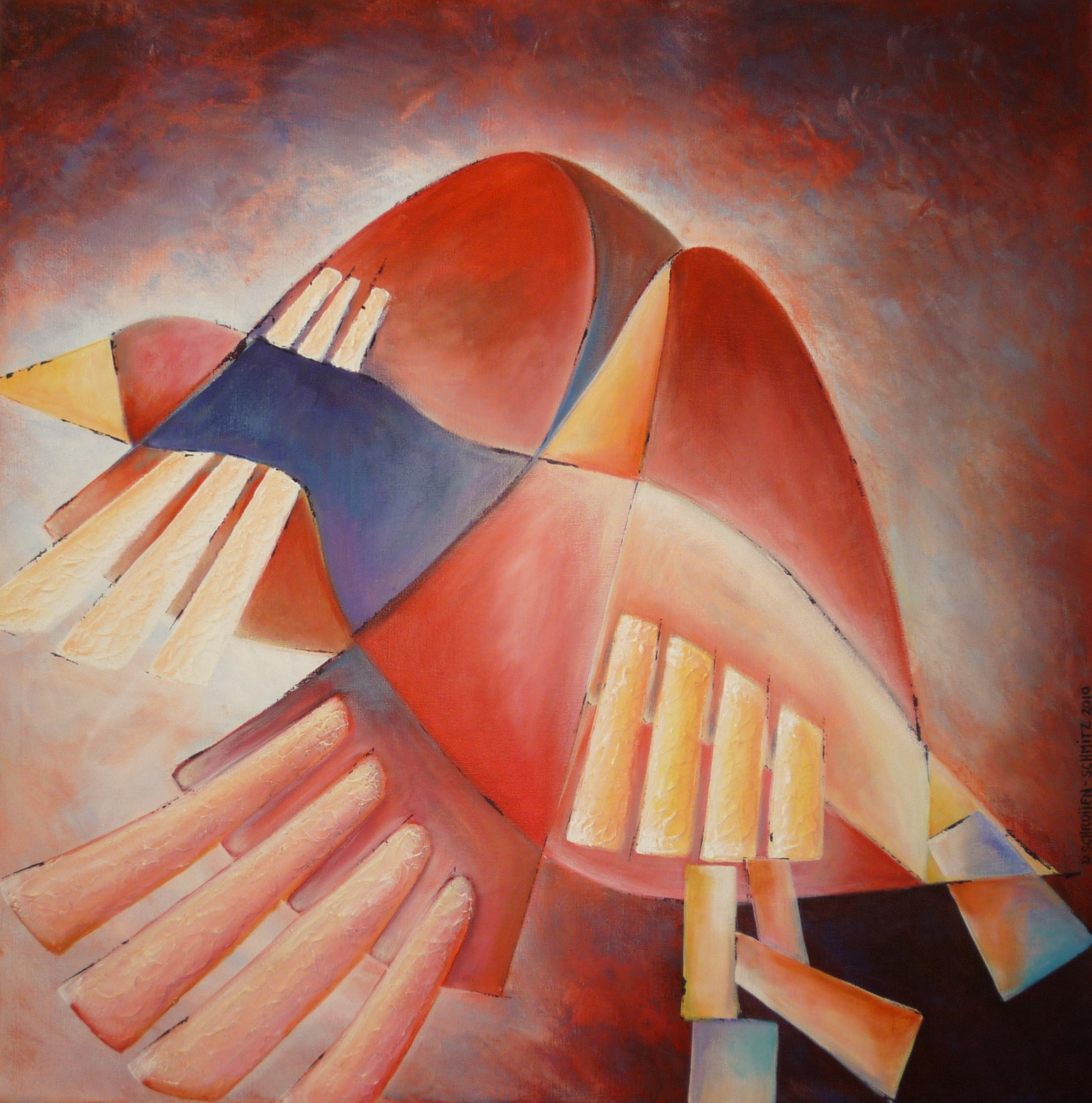 Veelal warme kleuren. Op 3d-doek gemaakt.