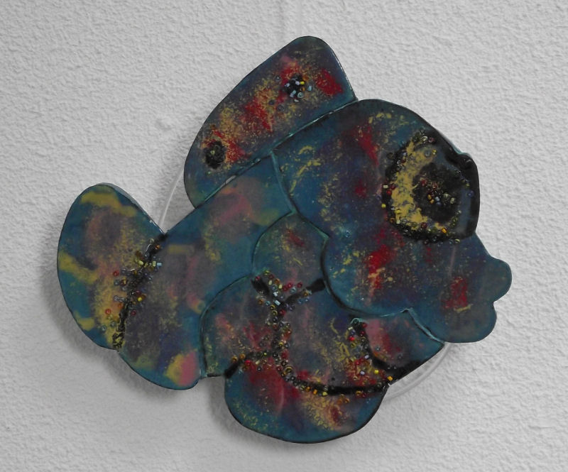 Emaille-Vis gemaakt van emaille op rood koper. De ondergrond is Trespa, kunststof , zodat de decoratie zowel voor binnen als buiten gebruikt kan worden.