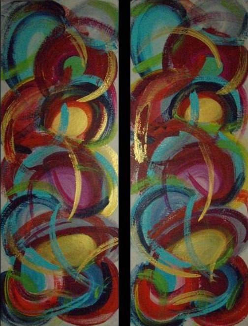 Dit 2-luik is in opdracht gemaakt en vernoemd. Beide schilderijen kunnen in 4 verschillende posities gehangen worden. Zowel in de lengte als breedte variant zijn leuke combinaties mogelijk. Bij het verhangen kan tevens gekozen worden om de schilderijen op dezelfde hoogte te hangen of trapsgewijs. Ongekend veel variaties zijn mogelijk. Door dit extra gegeven zijn deze 2 schilderijen extra spannend en geven door verandering van positie steeds weer een nieuw, levendig en verfrissend beeld in uw interieur. Wordt verkocht als set van 2.