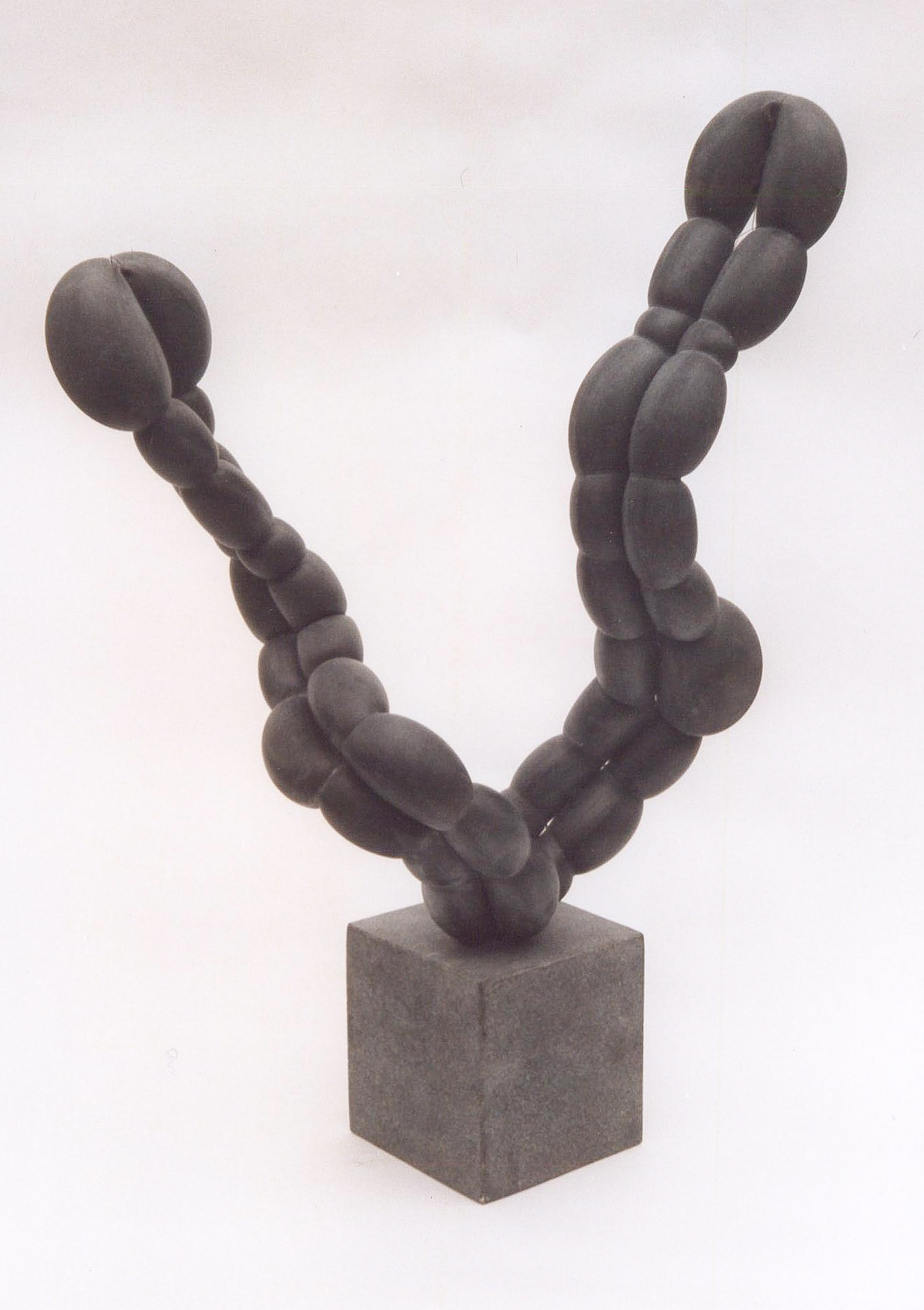 Materiaal: fietsbinnenband, staaldraad, nylondraad, zwart graniet.