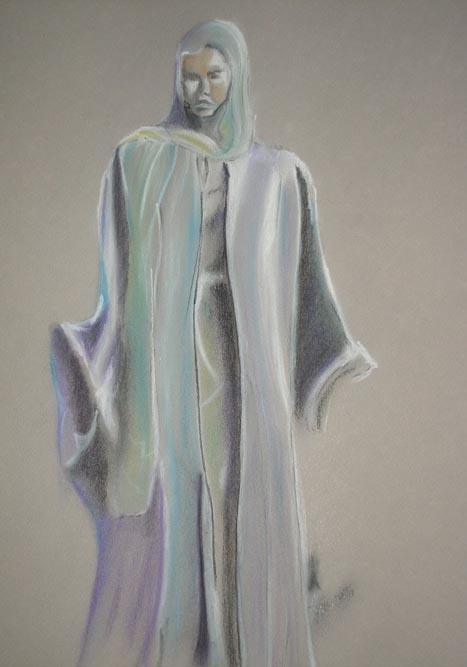 Vrouwen figuur in mantel op grijs papier