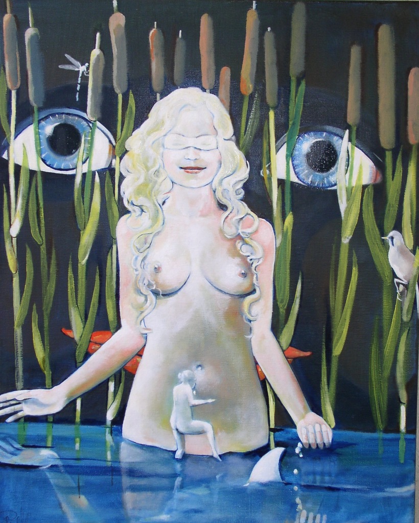 Vrouw Naakt Blinddoek Water Riet Dolfijn Vogel Karekiet Kind Ogen Rietsigaren Libelle Mond Hoofd